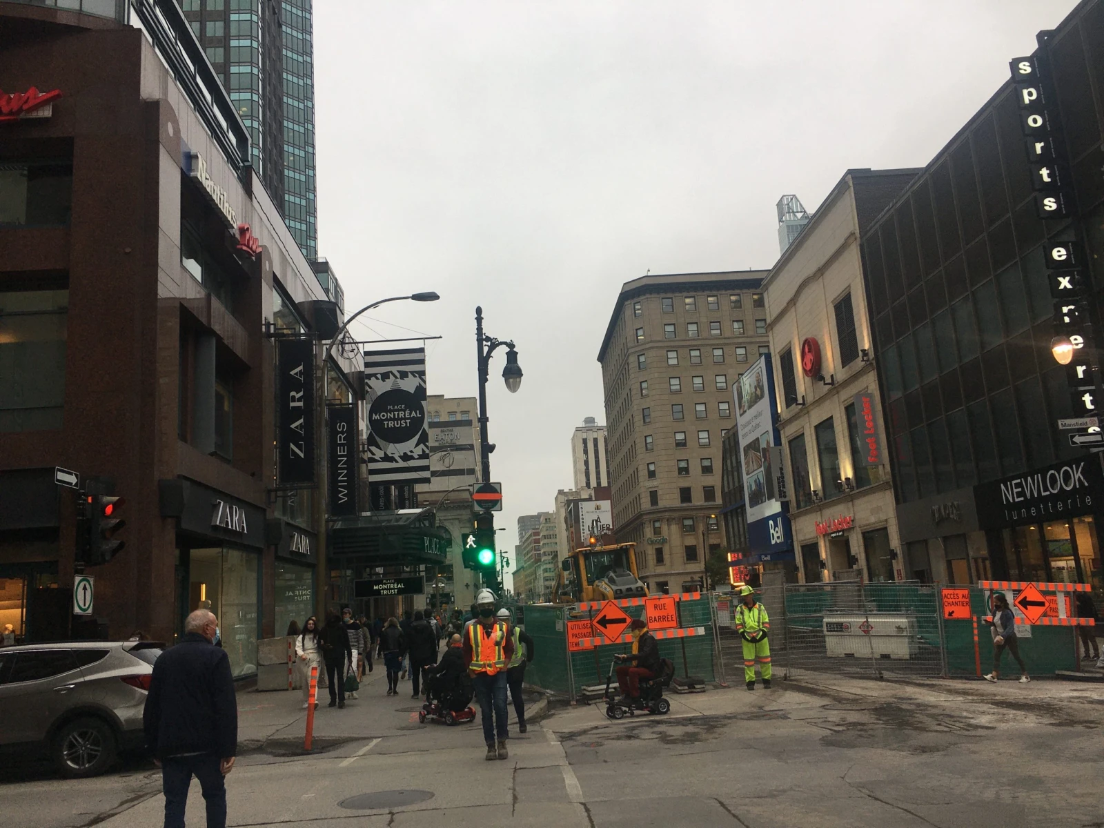 Premier constat: les seuls employés qu’on croise en ce jeudi midi gris et frisquet – à part ceux des établissements quasi déserts – sont ceux de la construction, à pied d’oeuvre littéralement partout dans le centre-ville, notamment sur un très long tronçon de Sainte-Catherine, la principale artère commerciale du secteur.