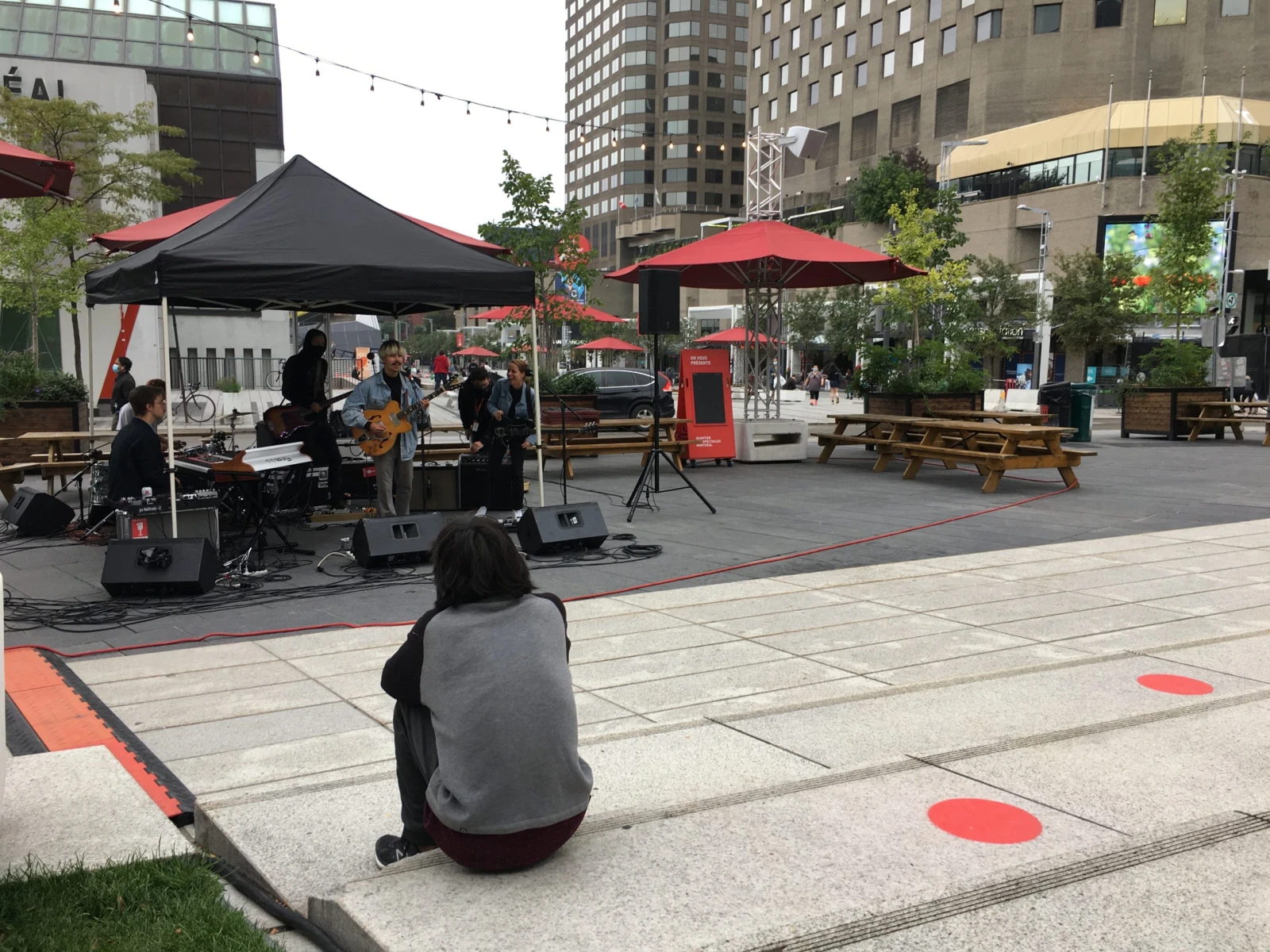 À l’ombre du Musée d’art contemporain, rue Jeanne-Mance, un band fait un soundcheck sous un petit chapiteau. Grâce à eux, les passants profitent d’une rare accalmie dans le brouhaha ambiant.