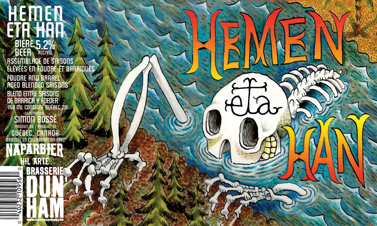 Ça dépend. Par exemple, je viens de terminer l’étiquette de la Duel, une bière faite en collaboration avec la Microbrasserie À la fût, un assemblage de bières barriquées. Ces temps-ci, je suis dans une phase squelette, alors je suis parti de là pour l’inspiration. Et comme À la fût est une micro de St-Tite, j’ai donné un petit côté western à l’illustration! Souvent, on ne se casse pas le bécyk : faut juste que ce soit beau! On a fait une autre collabo avec Naparbier, une microbrasserie de Barcelone qui habituellement travaille avec un illustrateur qui fait beaucoup de gravures dans un style un peu métal. J’ai voulu coller à leur esthétique et ça a donné… un autre squelette!