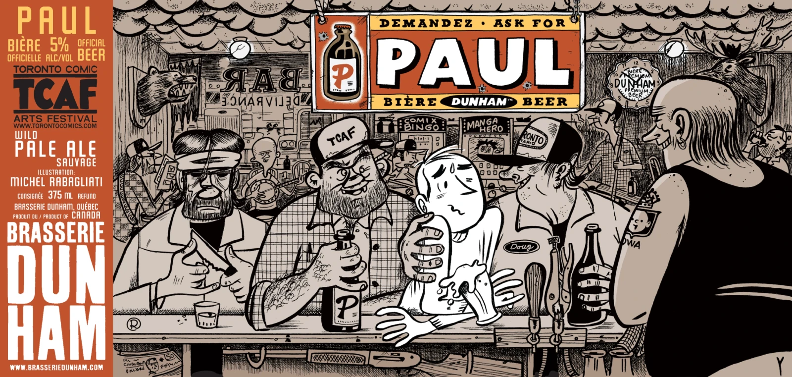 Exact. Je fais des étiquettes, mais c’est aussi moi qui coordonne le travail des illustrateurs avec qui on fait affaire. Souvent, ce sont des artistes issus de la BD parce que c’est du monde qui travaille fort et qui ont une imagination débordante. Dès 2014, on a commencé à passer des commandes : Benoit Tardif, Julie Doucet, Stéphane Blanquet (un illustrateur français) ont fait partie de la première mouture des étiquettes. Et ça a été super bien reçu par les amateurs de bière, qui sont généralement des trippeux, des gens motivés, curieux, qui vont remarquer tous les détails entourant la bière.