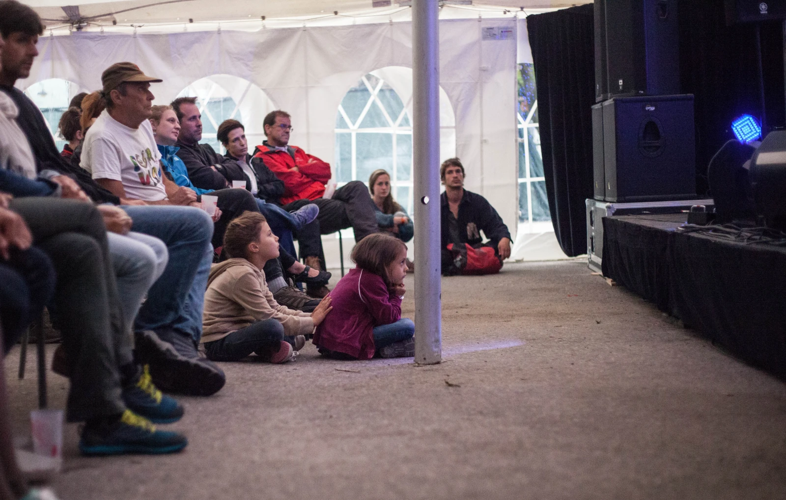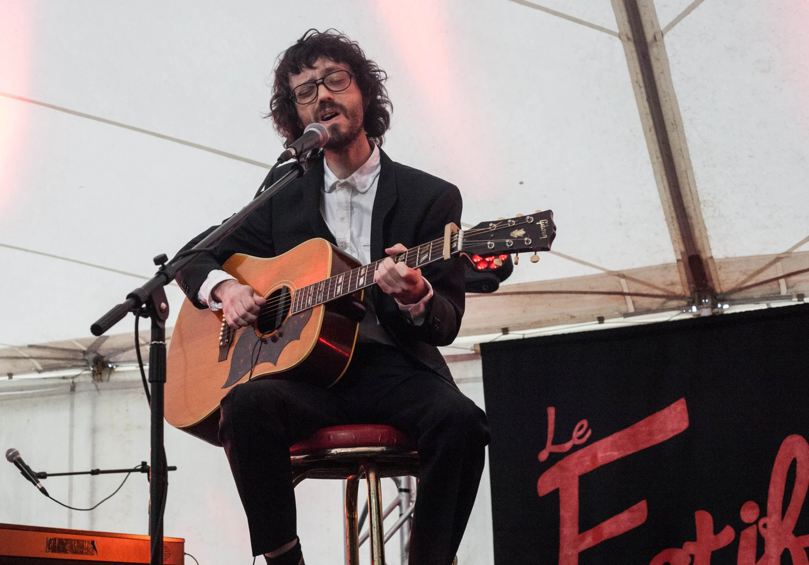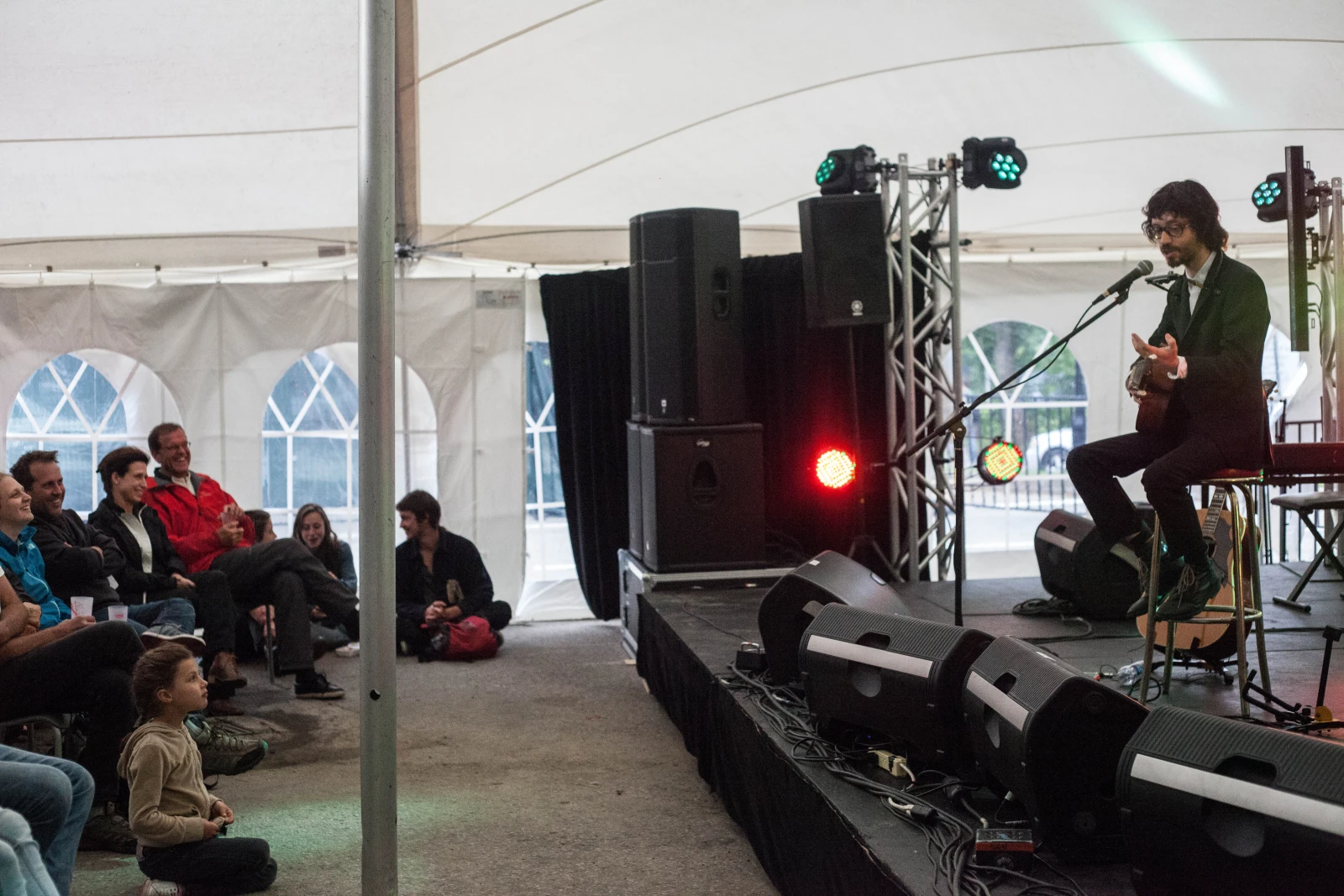 – Philippe B orné d’un solide duo de choristes/multi-instrumentistes, qui raconte encore autant d’affaires qu’il chante de tounes réarrangées, sous un minuscule chapiteau un après-midi de lendemain de veille avec le public qui se met spontanément à fredonner “Calorifère”, enfants inclus.