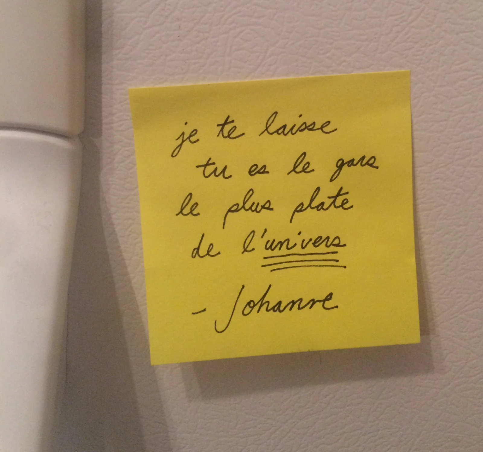 Rendu dans ma cuisine, j’avais beau être sur le high d’avoir fait mon lit, ce que j’ai trouvé sur la porte mon frigidaire m’a complètement renversé :