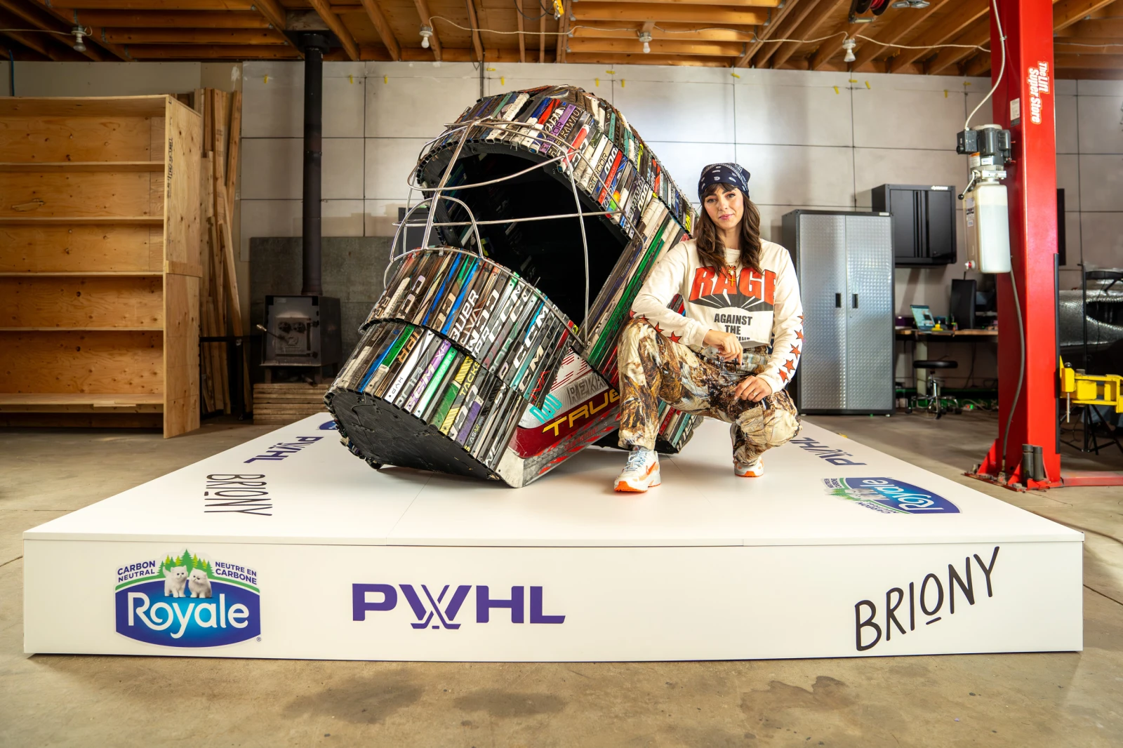 De toute cette frénésie est née une œuvre d’art qui en met plein la vue. Commandée par Royale et intitulée The Inaugural Six (Les Six Inaugurales, en l’honneur des six équipes de la LPHF), l’œuvre réalisée par Briony Douglas, une artiste multidisciplinaire de Toronto, est aussi épatante que son inspiration : les joueuses qui pavent la voie de celles de demain. L’énorme sculpture en forme de casque de hockey est non seulement imposante, elle est aussi entièrement composée des bâtons de hockey des joueuses qui se sont affrontées au cours de la première saison de la LPHF – avant que l’équipe de Montréal devienne la Victoire.
