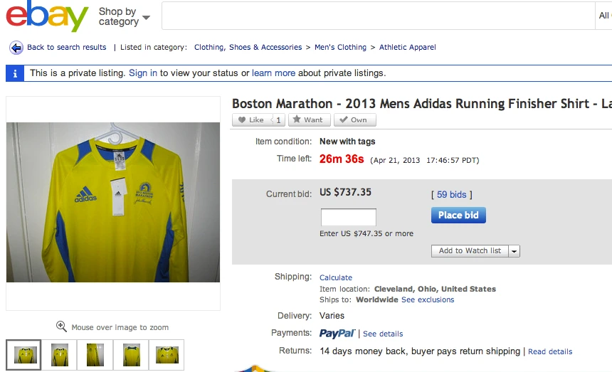 Opportunisme pécuniaire : des gens écoulent des médailles du marathon de Boston sur des sites d’enchères. Certains vendeurs annoncent qu’ils remettront la somme à des oeuvres caritatives, mais pas tous. Vraiment pas tous…