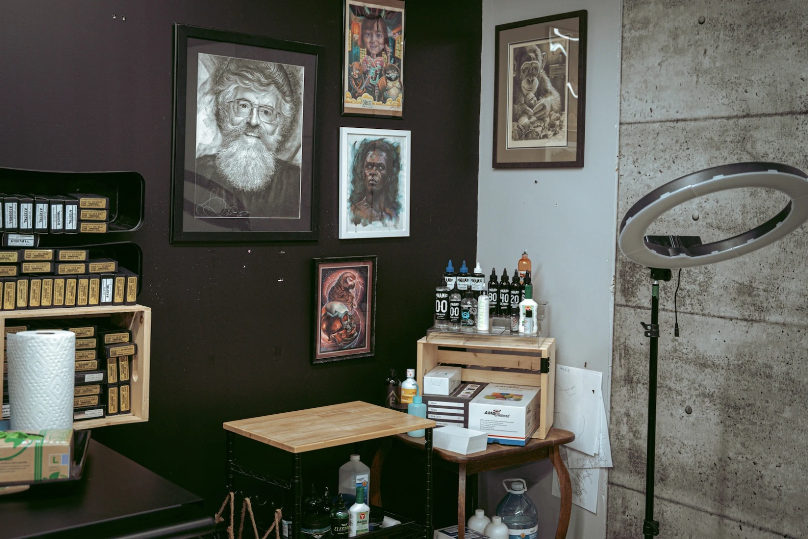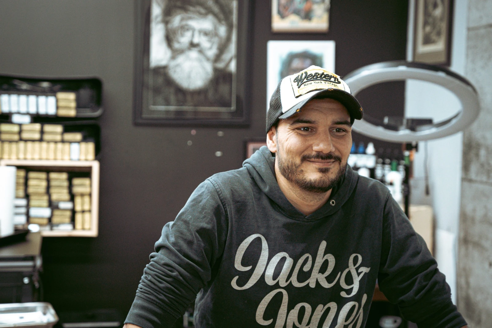 Pour percer le mystère, cap sur Saint-Eustache. C’est là, dans le sous-sol discret d’un tattoo shop, que je rencontre Jonathan Dupuis, l’artiste derrière le portrait. Grand gaillard réservé, il est à la fois amusé et presque gêné par l’engouement soudain que suscite son œuvre. « Je l’ai mis sur Marketplace un peu pour rire, avoue-t-il. J’avais une petite intention de le vendre, mais pas plus qu’il faut. »