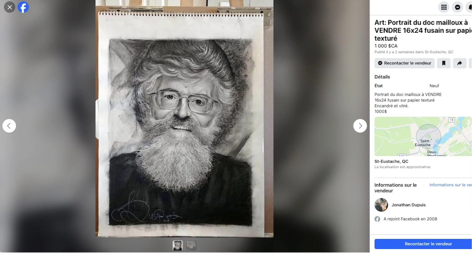 Depuis la fin janvier, une apparition insolite attise la curiosité sur Marketplace : un portrait du Doc Mailloux, minutieusement tracé au fusain, affiché à mille dollars. L’annonce provoque un arrêt du défilement, fait froncer les sourcils, arrache quelques exclamations. « Ben voyons, quessé ça? ». Une trouvaille qui suscite plus de questions qu’elle n’apporte de réponses.