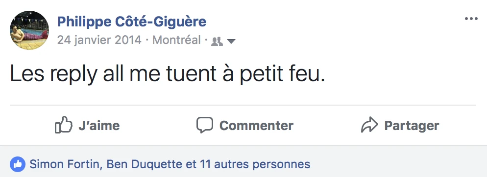 Cette haine pour le reply all ne date pas d’hier, dans mon cas, comme le prouve cette publication Facebook qui date de 2014. Et si je me fie aux multiples mèmes sur le sujet trouvés sur le web, je ne suis pas seul dans ma gang.