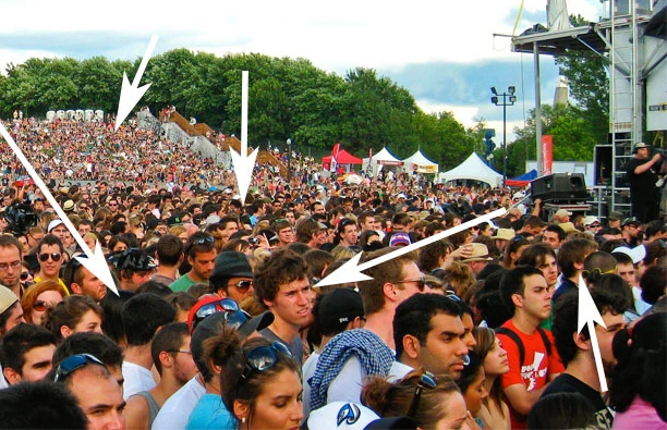 Tu vas te faire dépasser par des gens qui font semblant de chercher des amis. Ils les trouveront jamais. Ils vont s’arrêter devant toi dans la foule. C’est celui qui porte le sac-à-dos le plus gros qui sera devant toi.