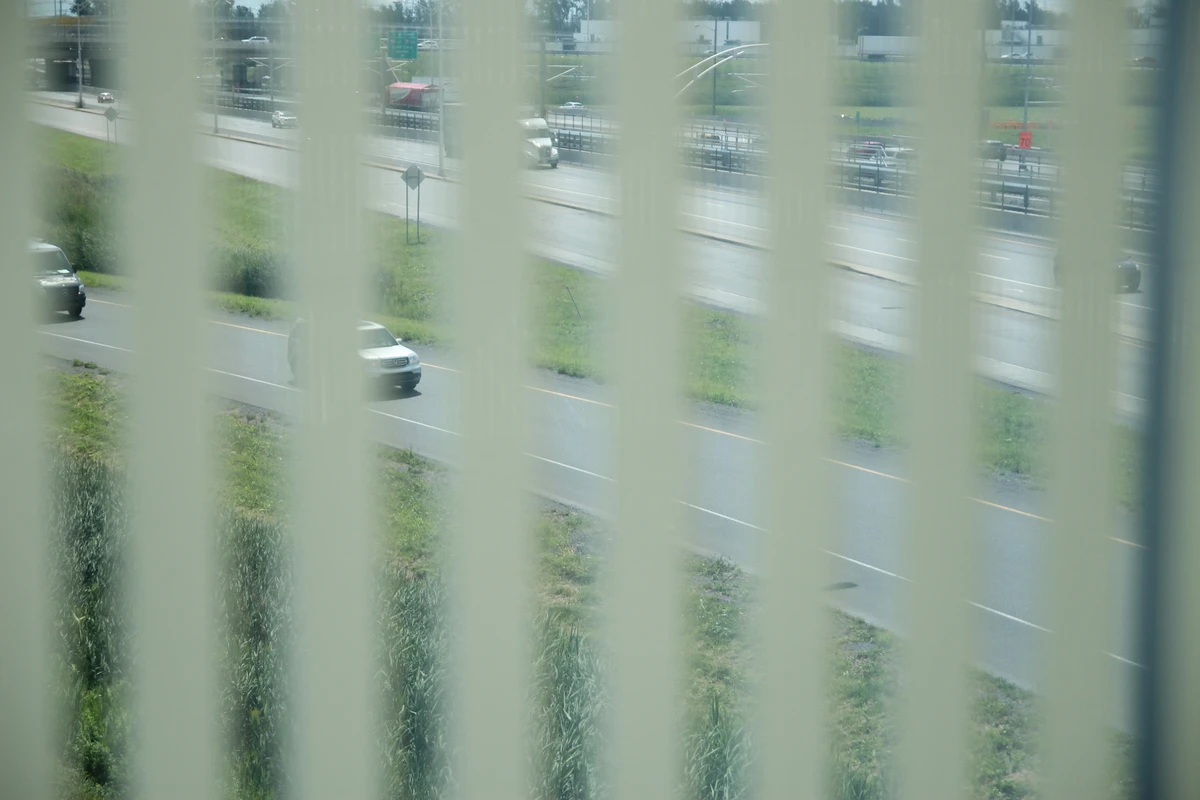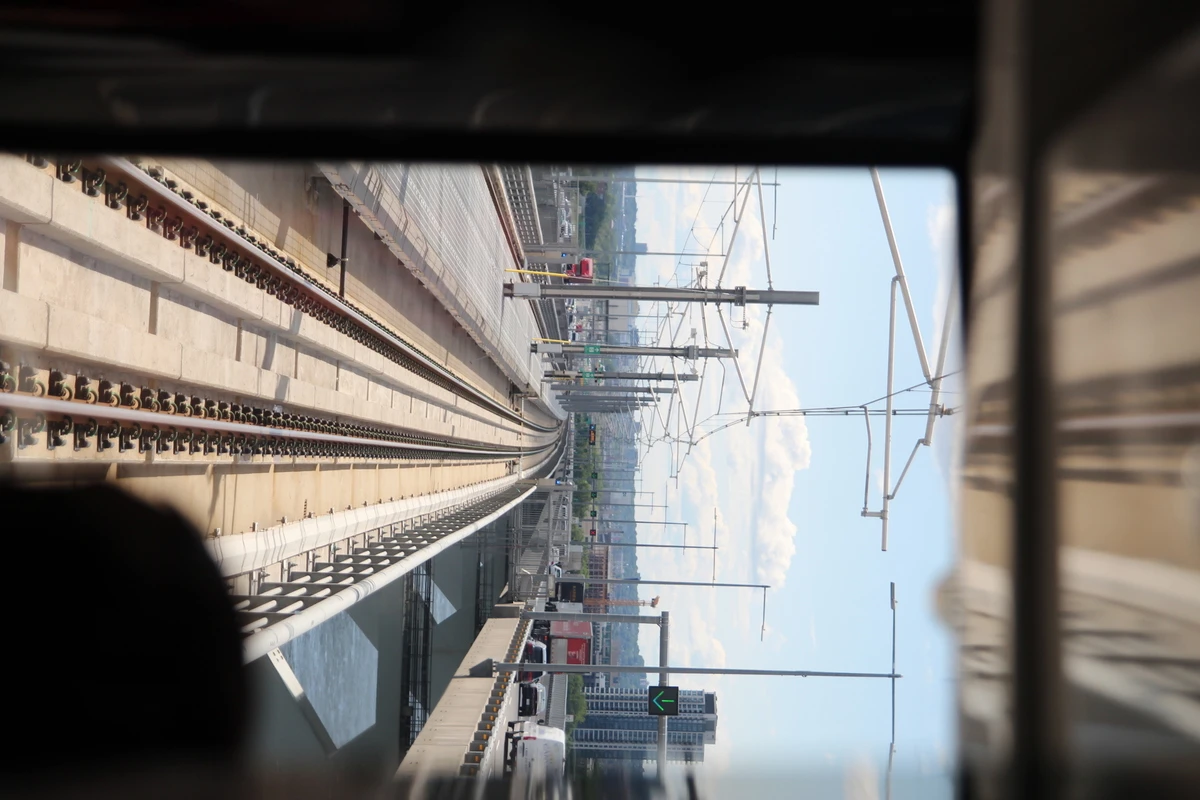 Une dame et sa petite-fille regardent par la fenêtre de la rame qui file à grande allure entre les voies nord et sud du pont Champlain. « Regarde, on va plus vite que les autos! », fait remarquer la première.