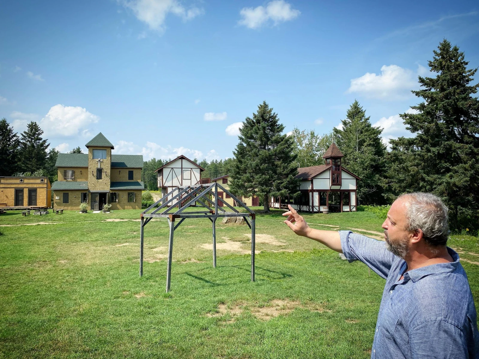 Olivier m’offre le tour du propriétaire du vaste domaine abritant 200 bâtiments éparpillés, construits sur une dizaine d’hectares du vaste domaine. Le son des grillons résonne et on pourrait tordre nos vêtements tellement c’est humide. Je n’ose pas m’imaginer vêtu d’une armure ou portant une cote de maille. On se dirige d’abord vers Arduinos, un quartier forestier aménagé à l’ombre des sapins.