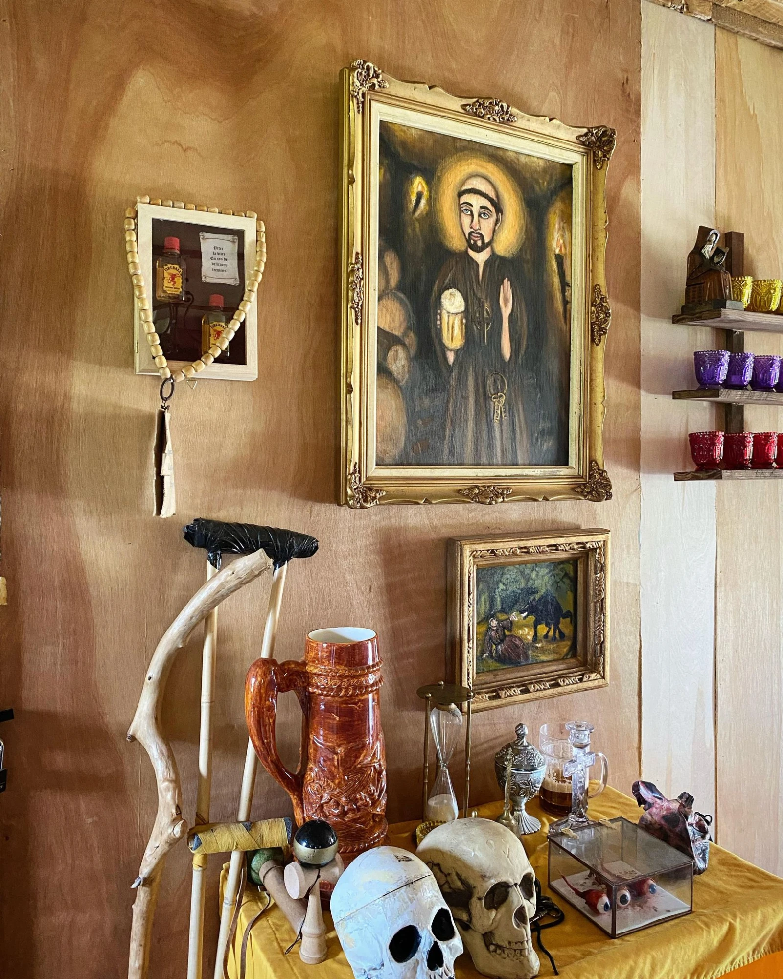 Le brave homme partage depuis plusieurs années le monastère avec huit de ses amis réunis au sein de l’Ordre du Saint-Soulard. « Notre groupe existe depuis 17 ans, au début on campait. J’ai alors vendu l’idée de construire un chalet collectif à mes chums. On s’amuse », résume simplement R émi, qui attend la visite de sa fille et ses deux petites filles. « Quand il y a un compte à régler, on fait boire les gens jusqu’au regret, c’est ça la punition », lance en riant le sympathique frère Imer, devant un autel à la gloire de Saint-Soulard. On y retrouve le crâne et les trois yeux du saint homme imaginaire.