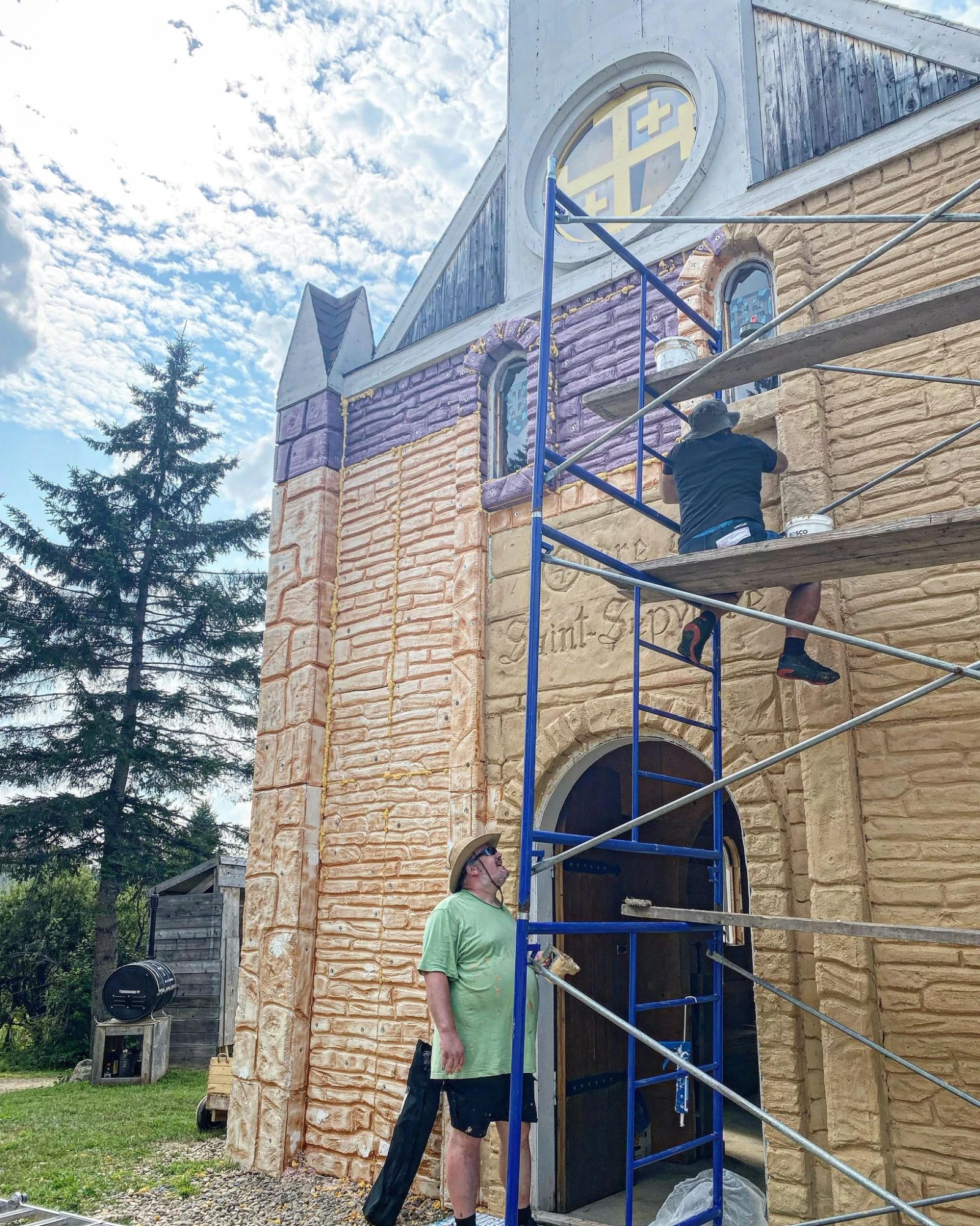 Sur le chemin du retour, les travaux sur la façade de l’église se poursuivent, malgré le soleil de plomb.