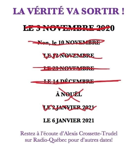 Les armées de Trump, aidées du FBI et de la CIA, devaient ensuite faire tomber un à un tous les complices de Biden, incluant Obama, Hillary Clinton, Justin Trudeau, François Legault, Horacio Arruda sans oublier Bill Gates, les damnés « merdias » à la solde des puissants et tutti quanti, avant de jeter tout ce beau monde en prison à Guantanamo.