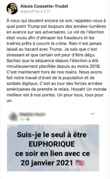 Même la veille de l’investiture, les ténors de la complosphère, Alexis Cossette-Trudel en tête, tentaient de se faire rassurants sur les réseaux sociaux où ils peuvent encore sévir, après avoir été (selon eux) muselés par le gouvernement sur diverses plates-formes traditionnelles. « Je sais que c’est stressant et que plusieurs ont peur d’être déçus », soulignait Cossette-Trudel, ajoutant que c’était maintenant au tour des militaires américains de faire la job.