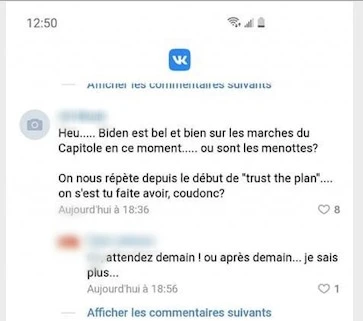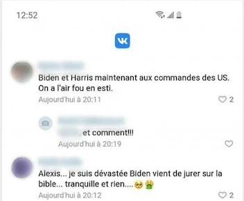 « Biden et Harris maintenant aux commandes des US. On a l’air fou en esti », déclarait une Sylvie sur la page VK d’Alexis Cossette-Trudel. « Où sont les menottes?» demandait un autre internaute, en se demandant s’il s’était fait avoir.