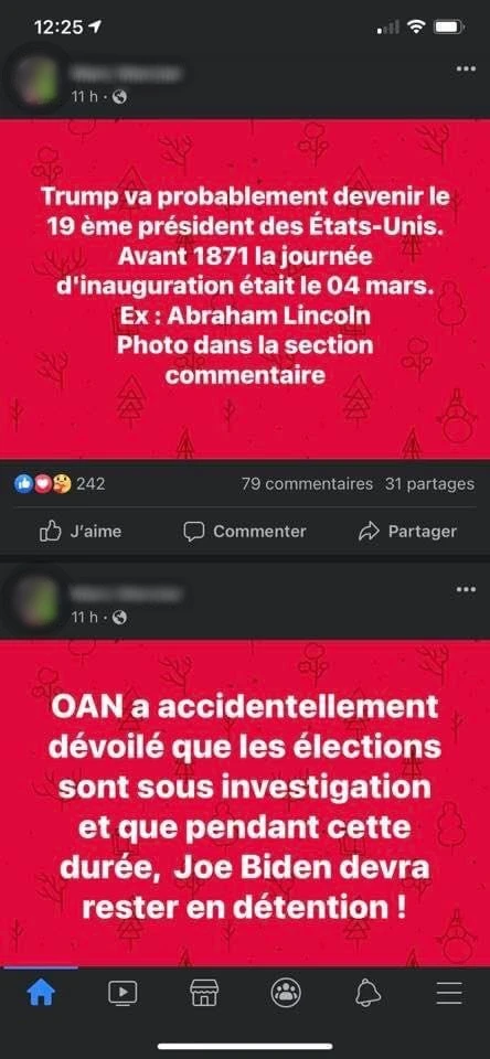 André souligne toutefois que les adeptes de QAnon demeurent marginaux dans les rangs complotistes et que la plupart font plutôt front commun contre les mesures sanitaires ou big pharma. « Ils ne sont pas nombreux, mais ils sont vraiment intenses », nuance André, qui ne pense pas que l’investiture de Biden va refroidir leurs ardeurs. « Je pense que si tu crois à ces histoires-là, tu seras capable d’embarquer dans la prochaine théorie, te faire croire que le plan a changé, etc. », soupire André, qui s’explique bien mal cette fixation locale pour Trump et la politique américaine.