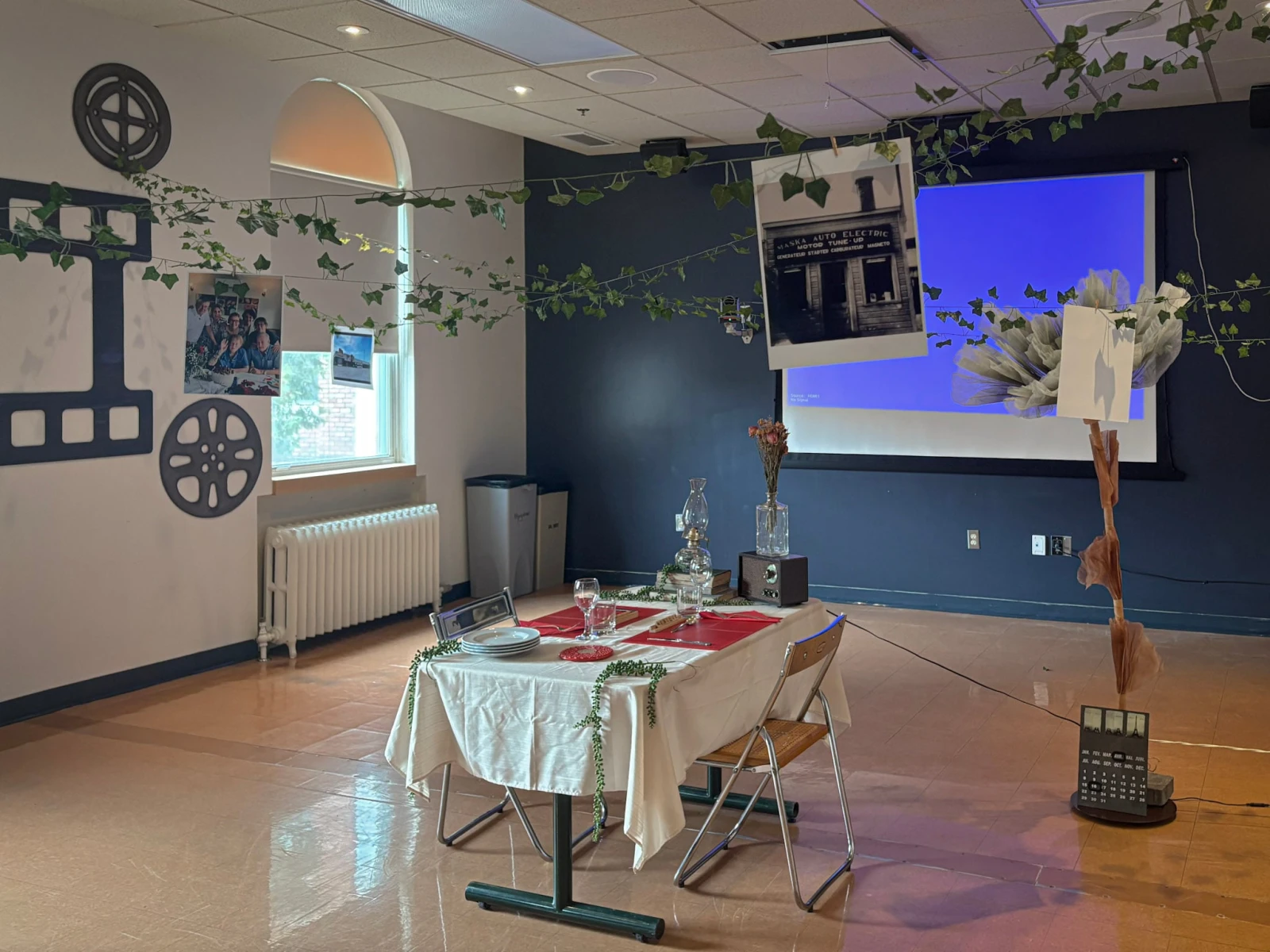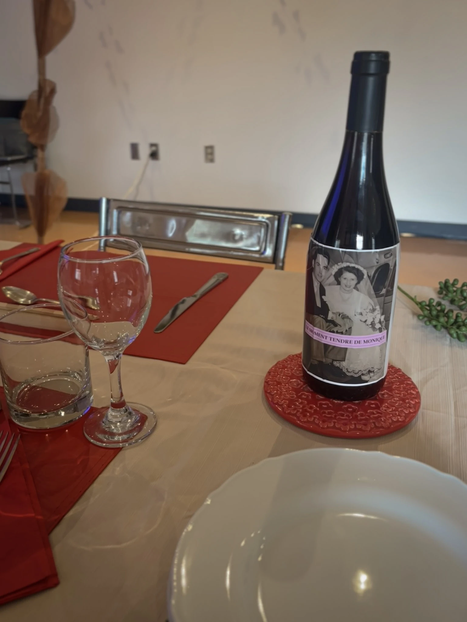 La table est mise au milieu de la salle, recouverte d’une nappe blanche. Dessus, il y a deux napperons rouges, des coupes de vin, un vieux poste de radio et un chandelier. Des vignes en plastique sont suspendues au-dessus, pour l’ambiance. De vieilles photos y sont épinglées. Sur l’une d’elles, Monique Letendre a 18 ans et vient d’être adoubée duchesse de Saint-Hyacinthe.