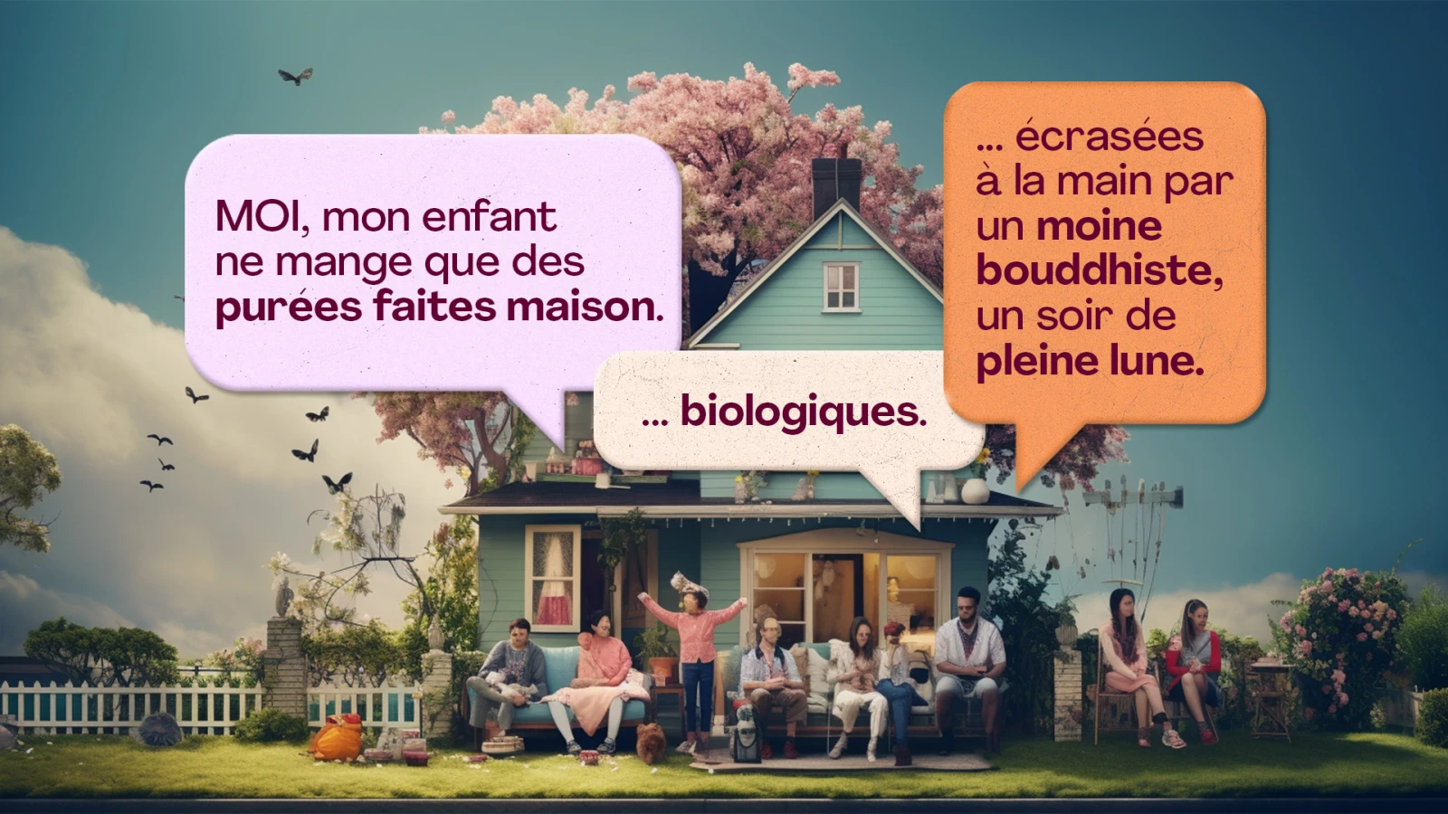 « MOI, mon enfant ne mange que des purées faites maison biologiques écrasées à la main par un moine bouddhiste, un soir de pleine lune. »