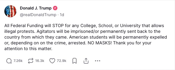 « Toute aide fédérale sera SUPPRIMÉE pour toute institution tolérant des manifestations illégales. Les agitateurs seront emprisonnés ou renvoyés dans leur pays d’origine. Les étudiants américains seront définitivement expulsés ou arrêtés, selon la gravité du crime. PAS DE MASQUES ! Merci de votre attention. »