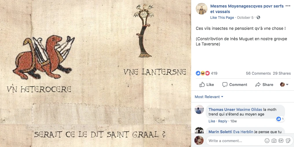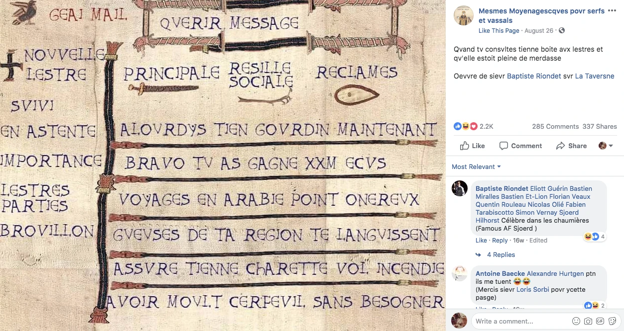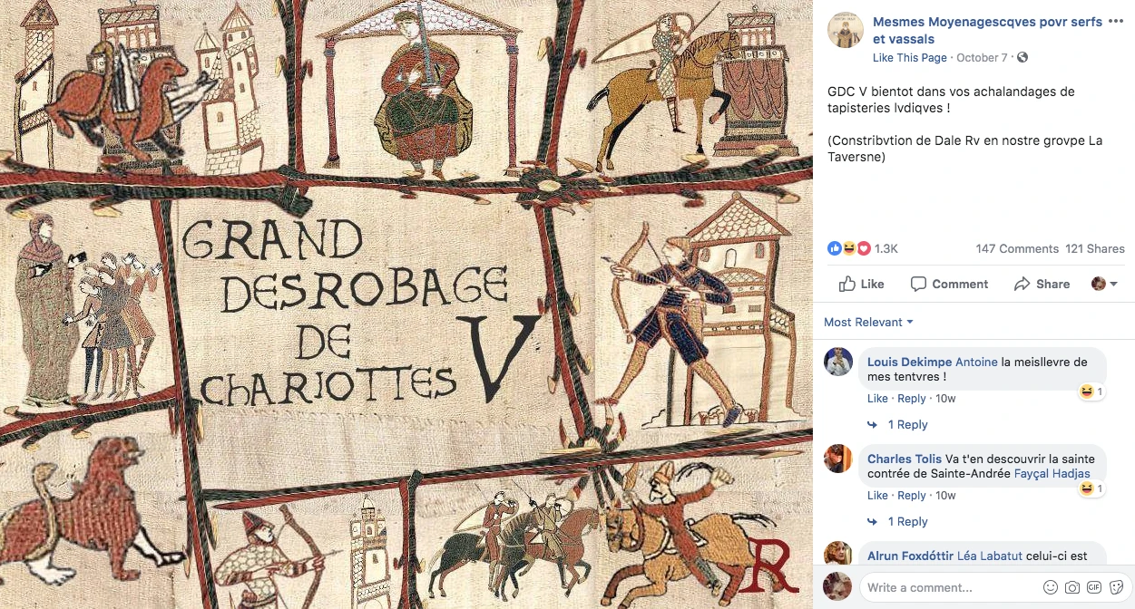 Cette page m’aura fait mourir de rire tout au long de l’année en recréant le plus souvent des memes préexistants à l’aide d’images manipulées inspirées de la tapisserie de Bayeux et de mots à l’orthographe caricaturant le vieux français. La plupart des posts sont en plus des créations des fans de la page, qui les partagent sur un groupe privés remplis de serfs et vassaux fort rigolos. Longue vie au cerfeuil!