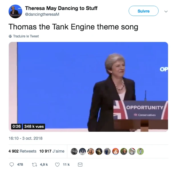 Y’a pas grand chose que la première ministre britannique va garder de bon de son année 2018 je pense. Politiquement, sa carrière est pas mal finie, mais au moins, elle nous aura légué cette fantastique image, on ne peut plus awkward, d’elle qui tente de danser sur du ABBA lors d’un congrès du parti conservateur du UK. C’est très blanc.