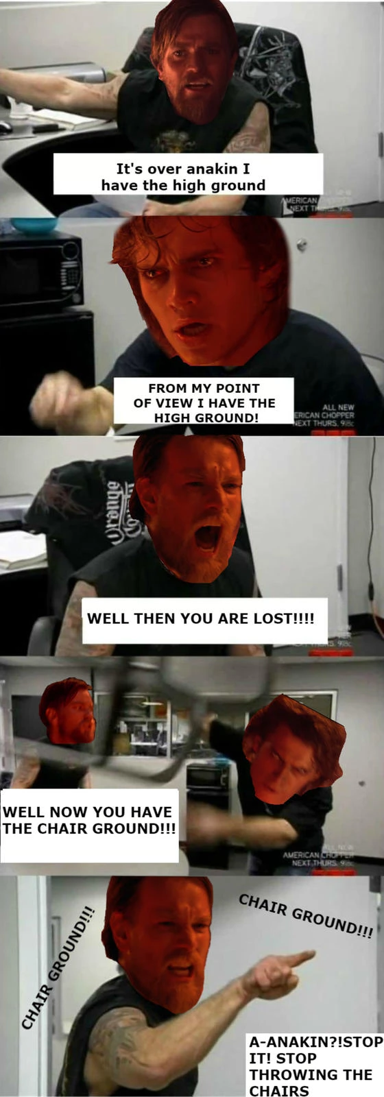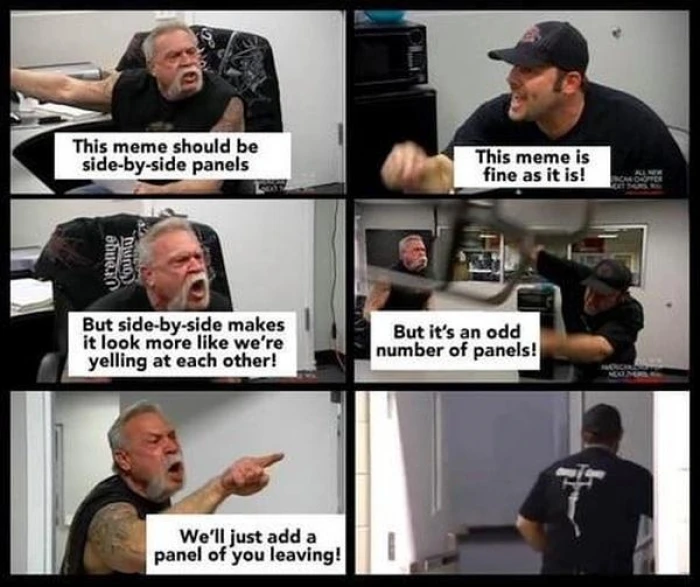 Tiré d’un épisode de la saison 6 de la série de télé-réalité American Chopper diffusé en 2009, la longue série de photos fucking trop intenses met en scène un père et un fils redneck à souhait s’engueulant vivement. Il nous en restera d’ailleurs un nombre étonnamment élevé de variations politiquement engagées, chose rare, mais à saluer!