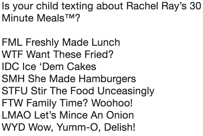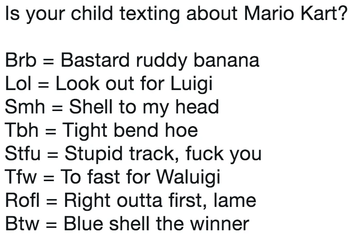 Ce meme remonte originellement à 2017, mais son template a été refait en janvier donc je vais laisser le bénéfice du doute. En gros, on y trouve une liste d’abréviations (souvent utilisées en langage web) et leur supposées significations pour aider les parents inquiets et numériquement nuls à s’y retrouver. Les meilleurs sont souvent ceux dont les sujets sont les plus obscurs!