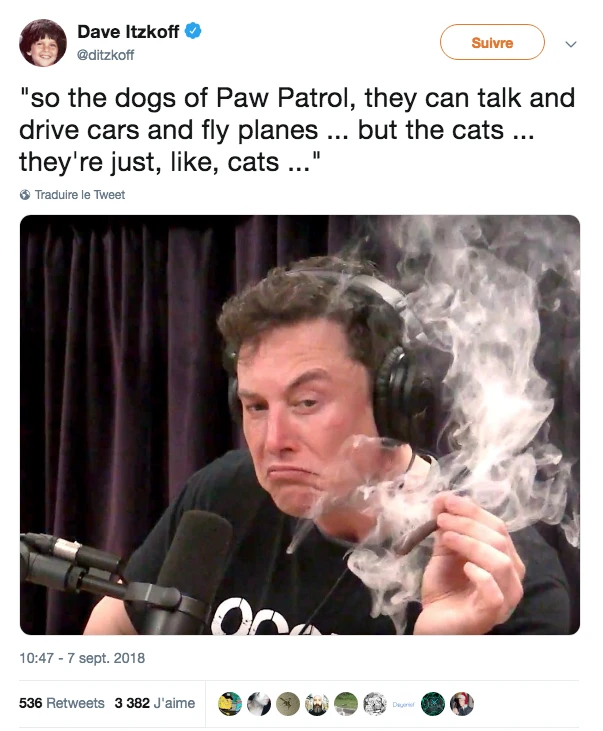 Le gars a eu une méchante grosse année. Il a envoyé un char dans l’espace, a sorti une couple de jours avec Grimes et a aussi découvert le weed. Ç’a d’ailleurs eu un impact important sur les actions de SpaceX. Il a donc rapidement tenté de faire disparaître les images, tirées de son passage au podcast Joe Rogan Experience le 6 septembre, mais c’est sous-estimer le web que de penser que c’est possible! Perso, je reste toutefois convaincu qu’il en fumait avant, et pas rien qu’un peu. Envoyer un char dans l’espace, tu penses pas à ça à jeun, mettons.