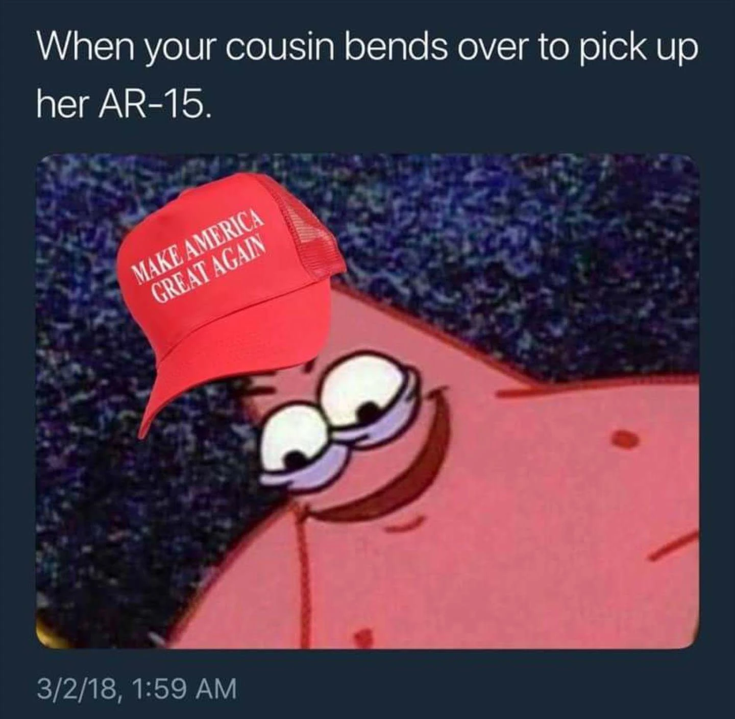 Eh oui, 2018 aura finalement été l’année de Bob l’Éponge. Et pas rien qu’un peu. Outre le fait que chaque maudite frame de la populaire émission jeunesse a été détournée au moins une fois, souvent pour des memes adultes, on compte au moins 3 trends majeurs, soit Krusty Crab vs Chum Bucket, Savage Patrick et SpongeBob NoPants (ou Tired SpongeBob selon les sources). Les deux derniers proviennent d’ailleurs du même épisode de la saison 1 de l’émission, Nature Pants, diffusé en 1999, et se déroulent à quelques secondes d’intervalle seulement. Faut croire que la nostalgie aura encore tout gagné!