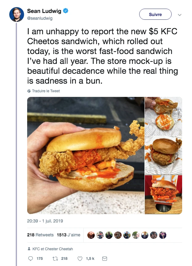 Quelle idée aussi de repousser les limites du fast-food pour une chaîne de restauration qui a de la difficulté à rendre son menu régulier appétissant ! Bien qu’il s’agisse d’un sandwich au poulet bien ordinaire avec une shot de sauce piquante, trois Cheetos et un peu de mayonnaise, c’est sûr que ça va pogner. Parce que les gens aiment ça se faire du mal.