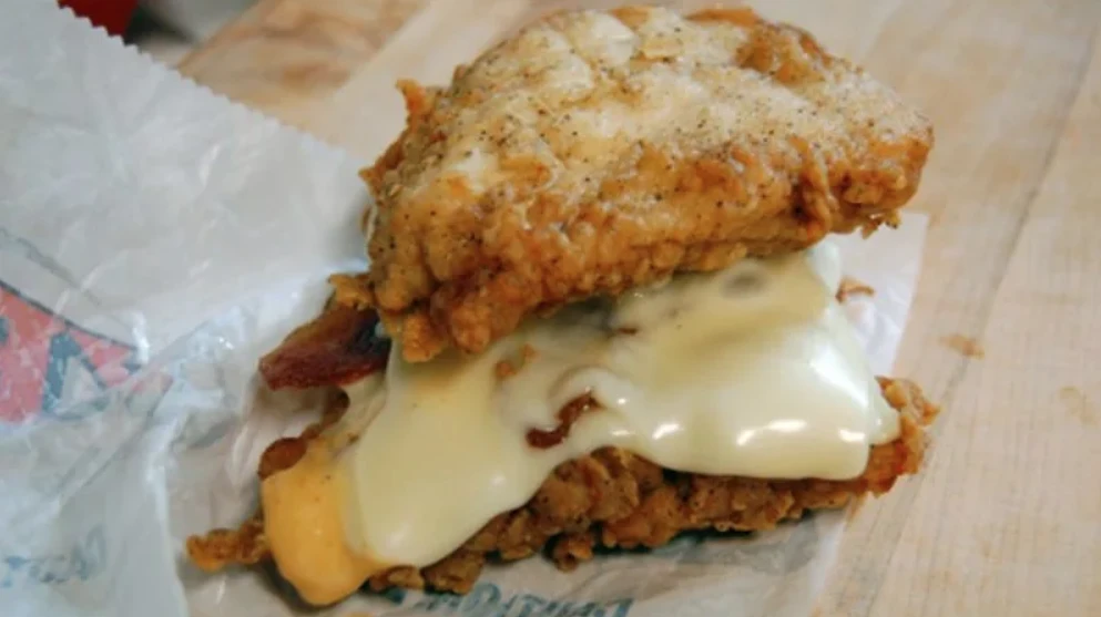 La mère de toutes les mauvaises idées. Inaugurée en 2010, ça lui a pris quelques mois à passer la frontière parce qu’elle faisait peur aux douaniers et au staff de Santé Canada. T’sais, pourquoi se contenter d’un morceau de poulet frit coincé dans un pain quand on peut bypasser le pain et manger une tranche de fromage entre deux morceaux de poulet frit? Parce qu’on veut vivre passé 40 ans? Parce qu’on se respecte en tant que personne?