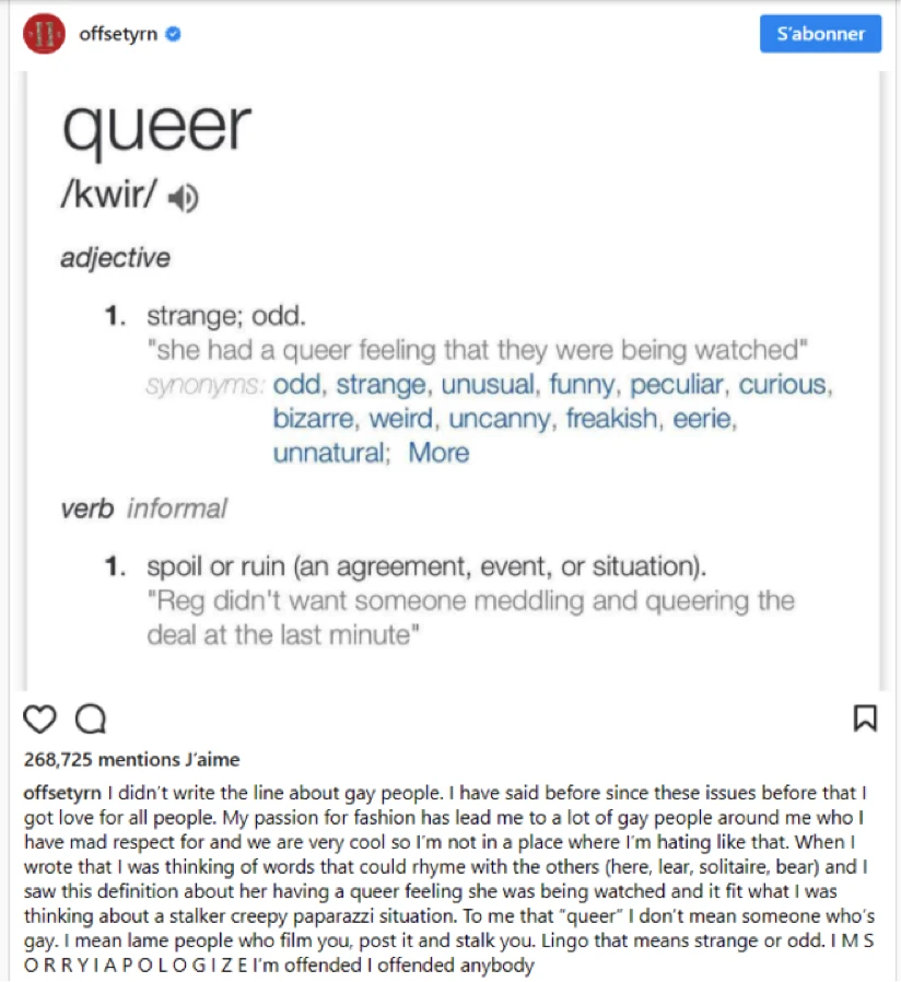 Suite au scandale, Offset a dû expliquer qu’il n’était absolument pas homophobe, puisque bon nombre de ses collègues dans l’industrie de la mode sont ouvertement homosexuels et qu’il est ben chill avec ça. En fait, il aurait choisi ce mot parce qu’il rimait, mais aussi pour son sens « traditionnel », « queer » faisant à la base référence à quelqu’un d’étrange, de différent. Bref, bonne nouvelle, Offset n’est pas homophobe, mais plutôt un homme littéraire incompris à la recherche de rimes complexes!