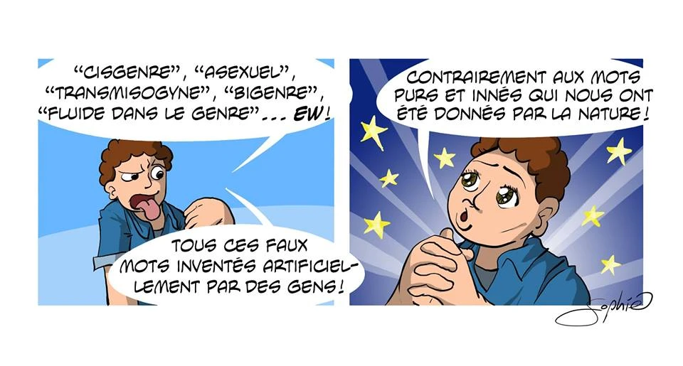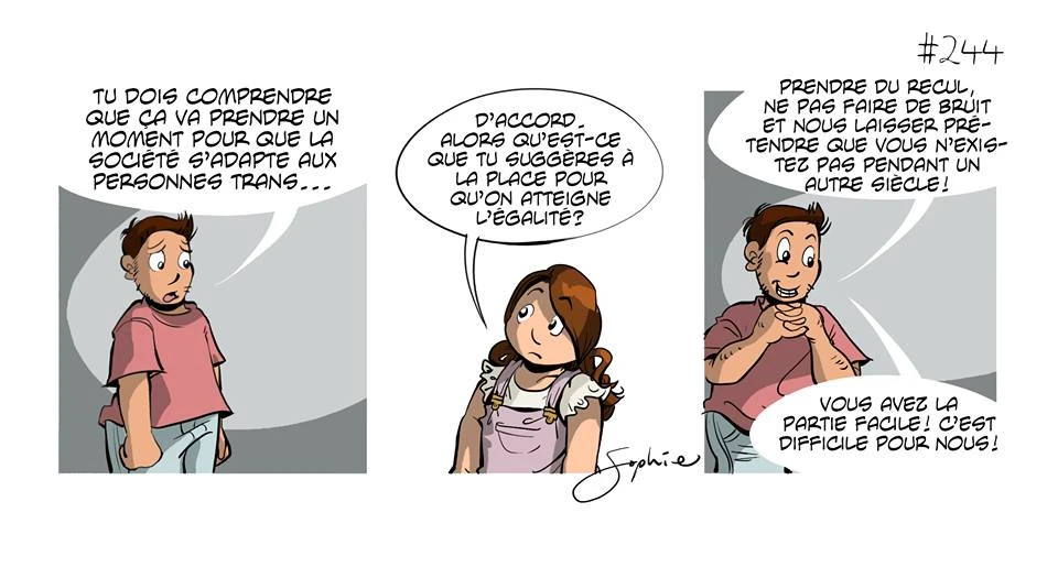 Son idée première, c’est de créer des personnages dans lesquels les personnes trans se reconnaissent. «Comme la plupart des produits culturels qui ont des thématiques trans sont faits pour des personnes non trans, il y a un regard externe, dramatique, sur la situation. Mon but, ce n’est pas d’éduquer les gens: c’est de faire rire les personnes trans, en pointant des situations de la vie quotidienne, en les tournant en blagues, en punchlines… c’est de reprendre le pouvoir. Les gens me disent qu’ils trouvent ça très humanisant, surtout qu’on est habitués à un regard documentaire sur les personnes trans», explique Sophie Labelle, qui s’exprime par la BD depuis qu’elle a 7 ans.