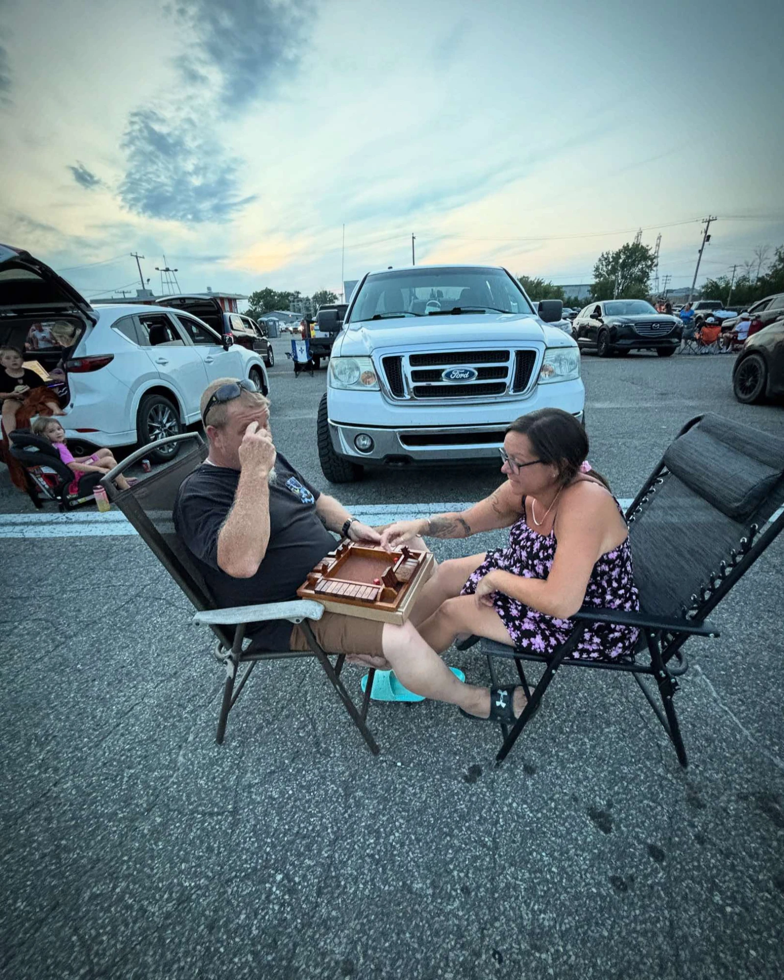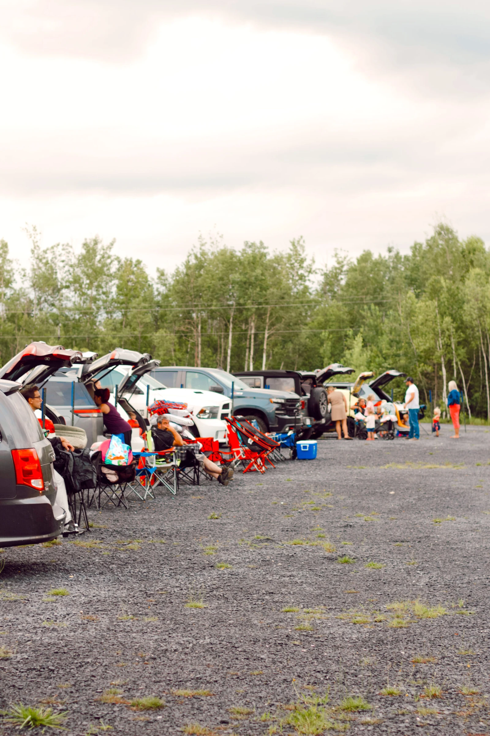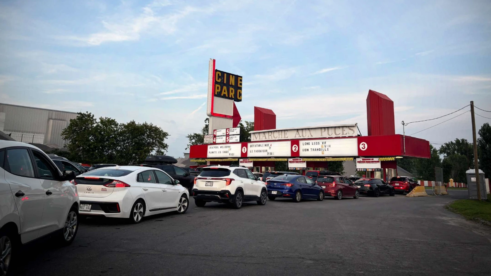 La file de voitures s’étire jusqu’à l’autoroute 640. Passé la guérite, ces véhicules s’éparpillent devant les cinq écrans. Il fait chaud, une odeur de pop corn et de vacances flotte dans l’air. En attendant leur film, les spectateurs jouent au ballon, à des jeux de société, font le plein au casse-croûte, promènent leur chien ou sirotent une bière sur des chaises de camping.