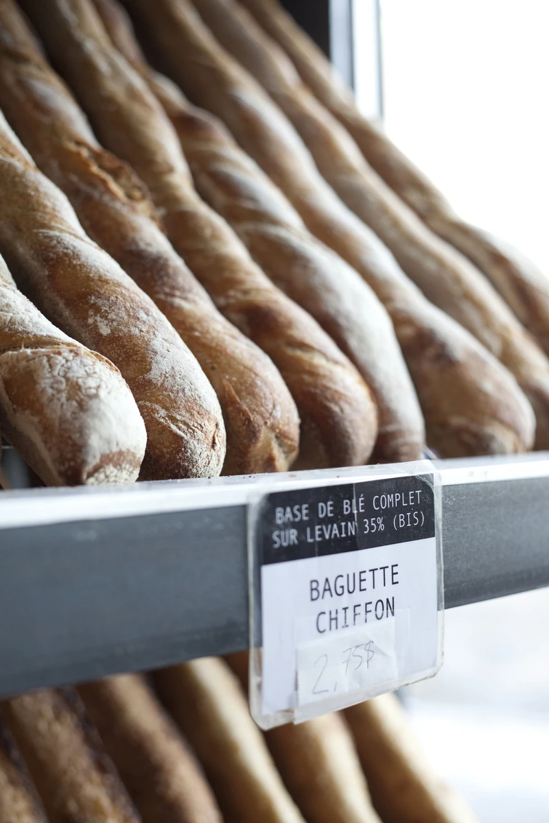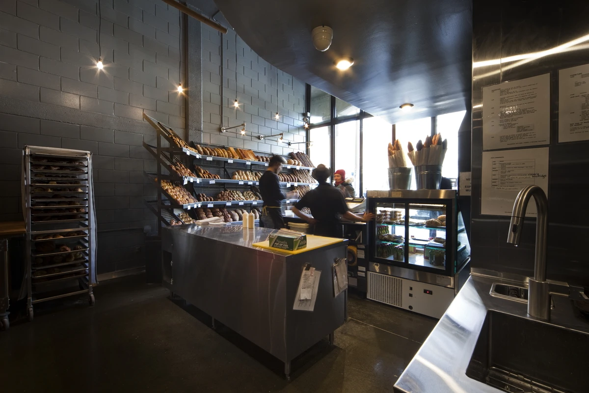 La boulangerie de Jeffrey Finkelstein aux allures épurées et brutes siège au 4524 Saint-Laurent. La façade qui donne sur la rue est tout en verre, créant un lien direct avec les passants et permettant à la lumière de pénétrer le commerce. On retrouve peu de fioritures, le plafond est en ciment inégal et le comptoir est en bois laissant apercevoir les tuyaux couleur rouille qui soutiennent la structure. Il en va de même pour les murs de bois tachetés de plâtre. Le nom en néon vert fluo qui trône au-dessus du comptoir abonde dans le même sens. Fait intéressant, derrière les présentoirs, une vitre permet de jeter un coup d’oeil sur la cuisine, donnant une autre perspective. Une grande table au centre rend le lieu plus convivial, invitant les clients à partager l’espace. Encore un travail impécable signé Zébulon Perron.