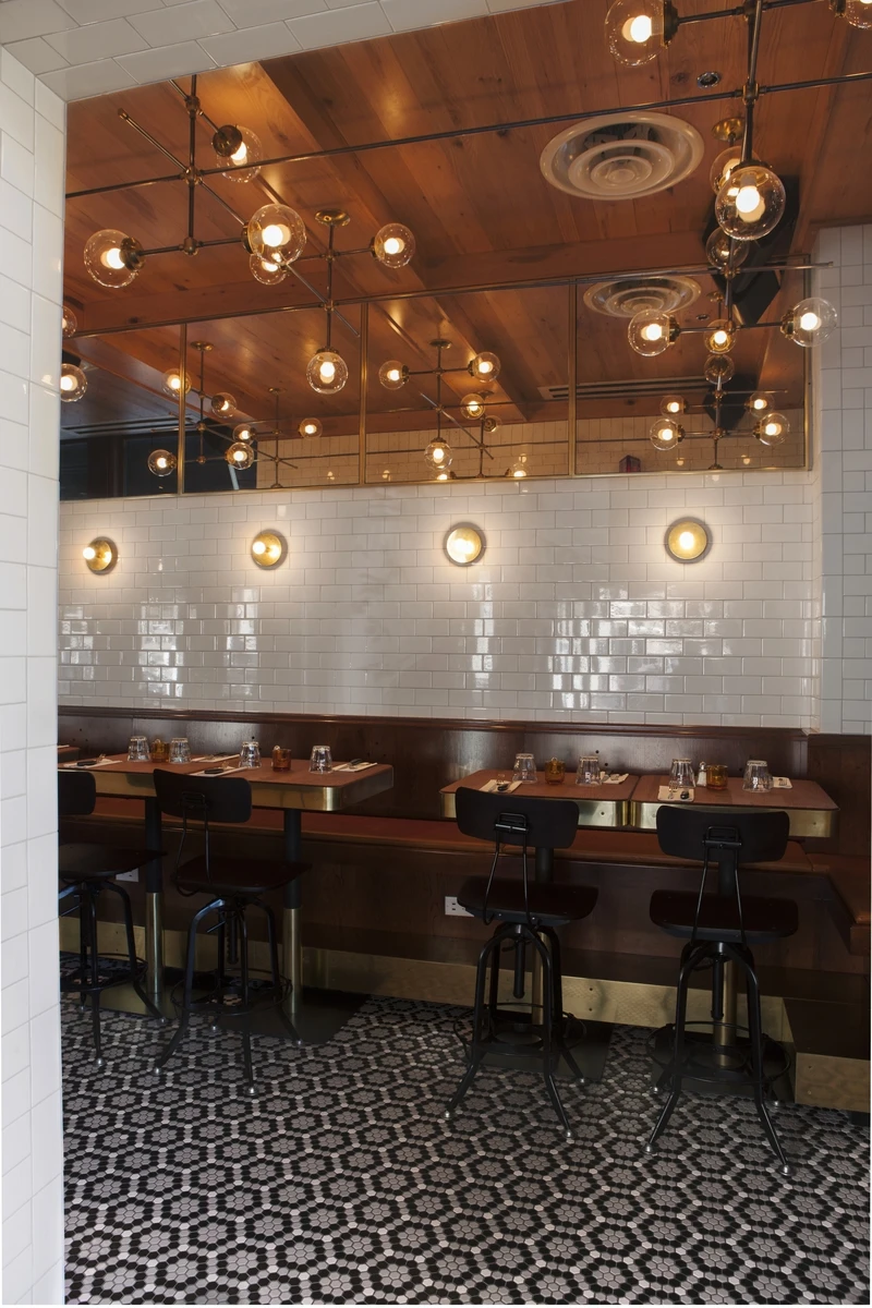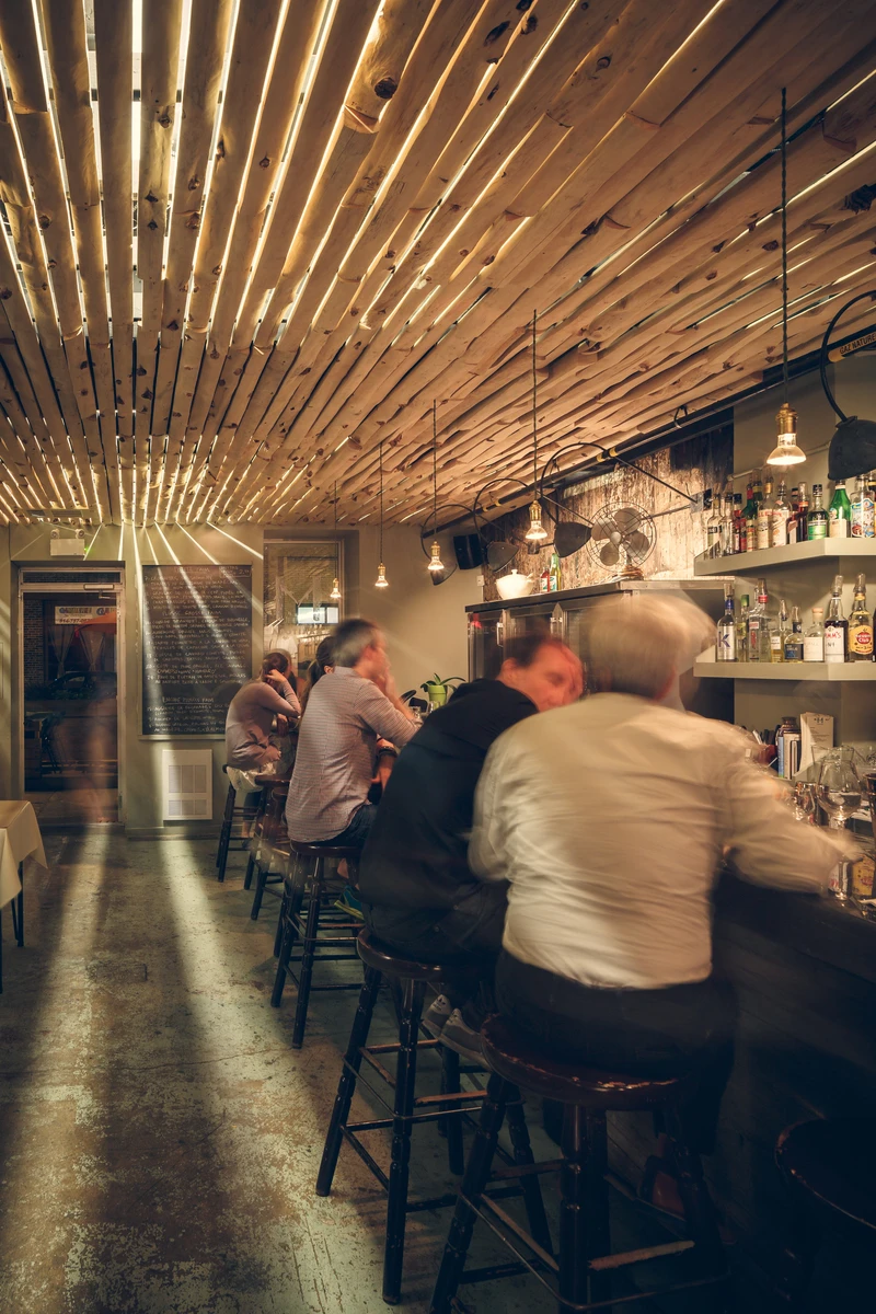 Renaissant des cendres de l’ancien Pub Rosemont, l’établissement de la famille Lévesque offre maintenant une atmosphère à l’opposé de celle qui y régnait depuis presque 30 ans. La terrasse, bordée d’un jaune vif attire les passants et les invite à découvrir le décor élégant et chaleureux créé par Zébulon Perron. Plusieurs des banquettes et des bancs sont en cuir blanc et sont tous modelés sur mesure. Le plafond est un élément central, il est couvert de petites lattes de bois et surmonté de luminaires impressionnants de couleur cuivre qui rejettent une couleur orangée et chaude. Une céramique bleu-gris forme la base du bar et vient éclairer l’établissement, tout comme les nombreux miroirs qui tapissent les murs et qui agrandissent la perception de l’espace. Une adresse élégante et chaleureuse.