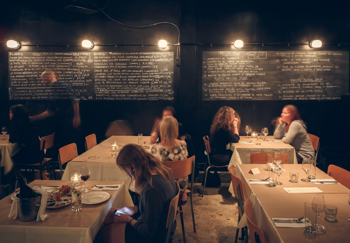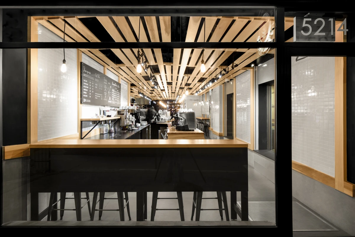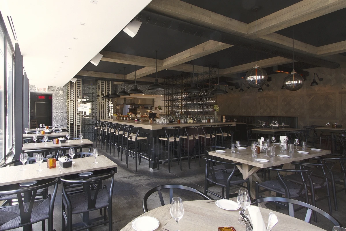 Le restaurant, situé au 345 rue Villeray attire le regard très vite, grâce à l’immense vitrine qui couvre la superficie sud du bâtiment et qui s’ouvre en été. On aperçoit rapidement la cuisine à aire ouverte, tout au fond. Cette dernière est recouverte de céramique à motifs bleue et blanche qui évoque l’Espagne. Le bar trône en plein centre de l’établissement tenu par Victor Afonso, Sebastien Muniz, Pedro Oliveira et la chef Marie-Fleur Saint-Pierre. Les verres à vin sont accrochés à un imposant porte-verre en métal noir. On observe une touche industrielle grâce aux luminaires d’usine et au béton. De petites tables rondes disséminées partout s’agencent avec des banquettes. Le mur en bois contre-plaqué ajoute une touche de convivialité à l’ensemble qui se veut déjà chaleureux de par sa configuration. C’est Surface3 qui a su insuffler cette chaleur à l’établissement.