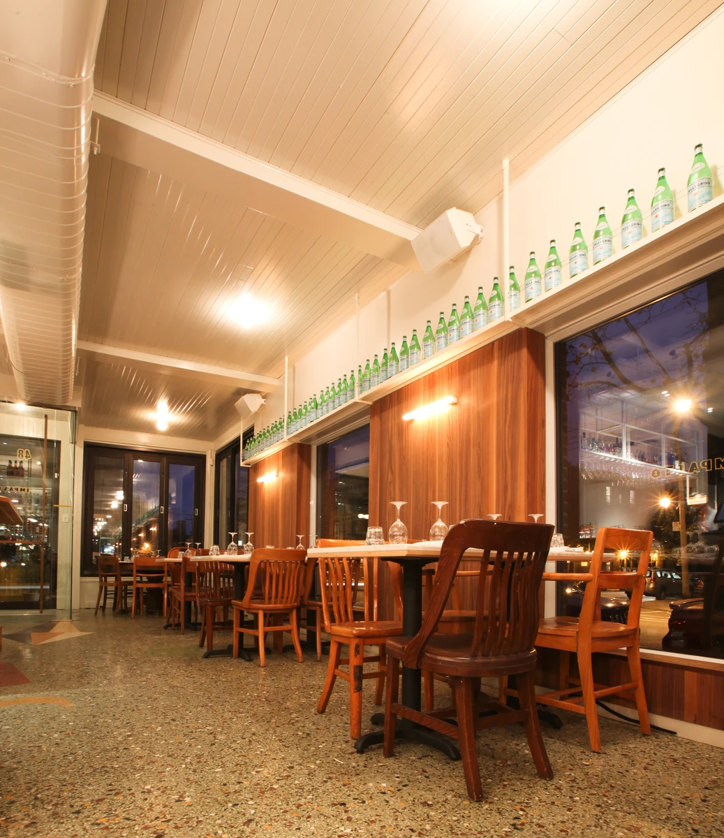 Nichée dans l’enceinte du théâtre Outremont, la Pizzeria N 900 est toute petite et faite en long. Mélanie Mailhiot propose une ambiance italienne à souhait dans un décor somme toute, assez sombre, sans exagération. Sur la terrasse à l’européenne, on se croirait à Naples. Une bicyclette peinte en jaune avec une jolie boîte de bois annonce l’emplacement du restaurant. Un cellier de verre trône au-dessus du bar et des baristas affairés. Les luminaires sont très graphiques, tout comme le plancher et le mur est constitué de céramiques blanches éclatantes. Une lumière chaude se dégage de l’établissement. Quelques tabourets jouxtent la vitrine, tandis que des banquettes couvrent l’arrière. Un travail élégant et réussi signé BlazysGérard.