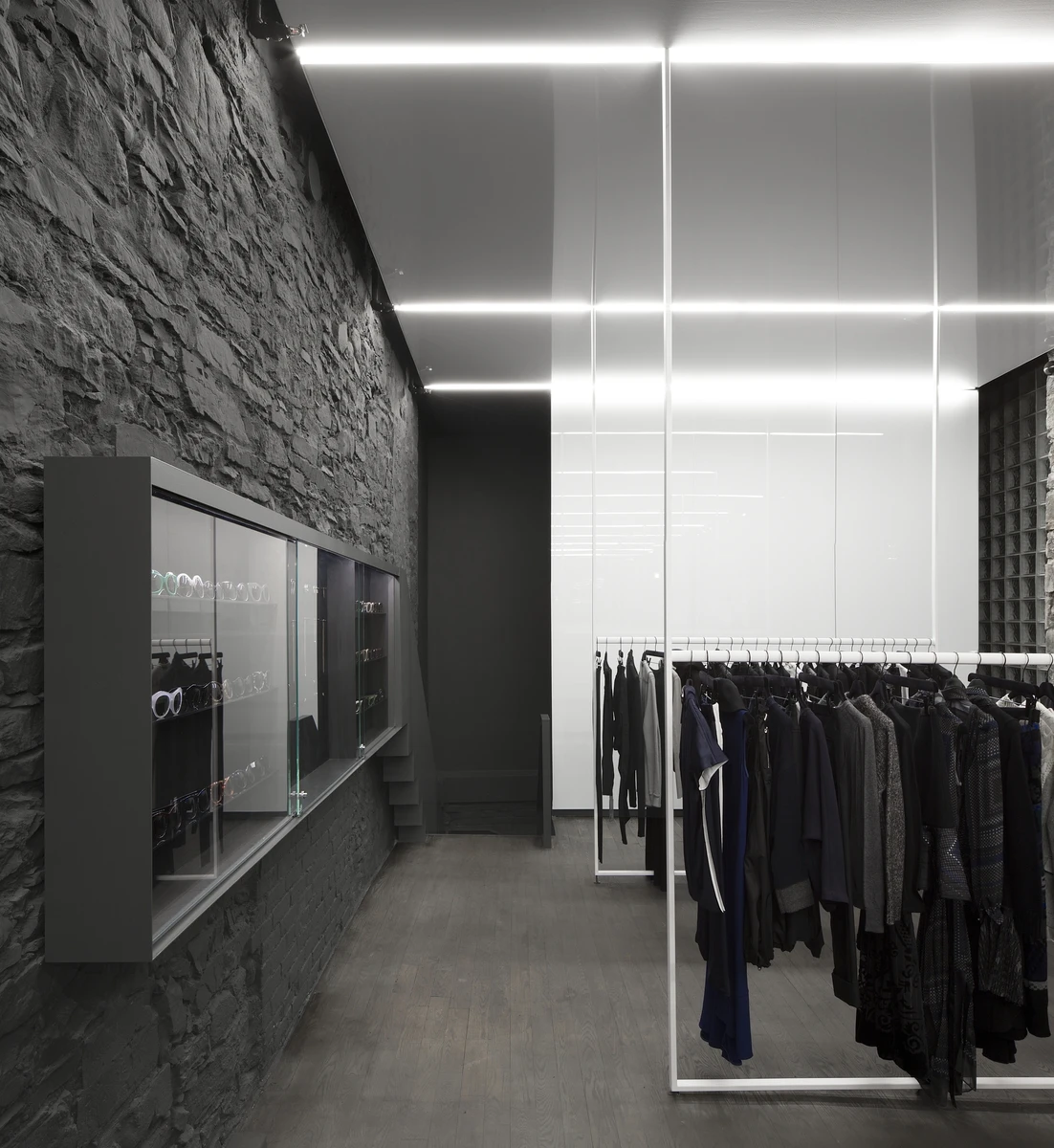 Situé au 5259 Saint-Laurent, au coin de Maguire, la petite boutique de Mylène Bélair offre à ses clients une vue sur l’atelier de création. Dans un décor moderne et minimaliste, il est possible d’admirer les œuvres de la designer québécoise, ainsi que quelques collections de bijoux. Le commerce est à l’image des vêtements, épuré et raffiné. On accède à l’atelier qui se trouve à l’arrière du magasin par de petits escaliers qui mènent à une mezzanine à peine camouflée par un mur blanc. Les moulures au plafond sont d’origine et repeintes en blanc. Le fibrociment est l’élément clé de la décoration et permettent de modifier le décor selon les collections. Le mur de briques et les lampes accrochées par des câbles en métal qui diffusent une lumières feutrées viennent appuyer le côté industriel. C’est à naturehumaine architecture et design que l’on doit cette innovation.