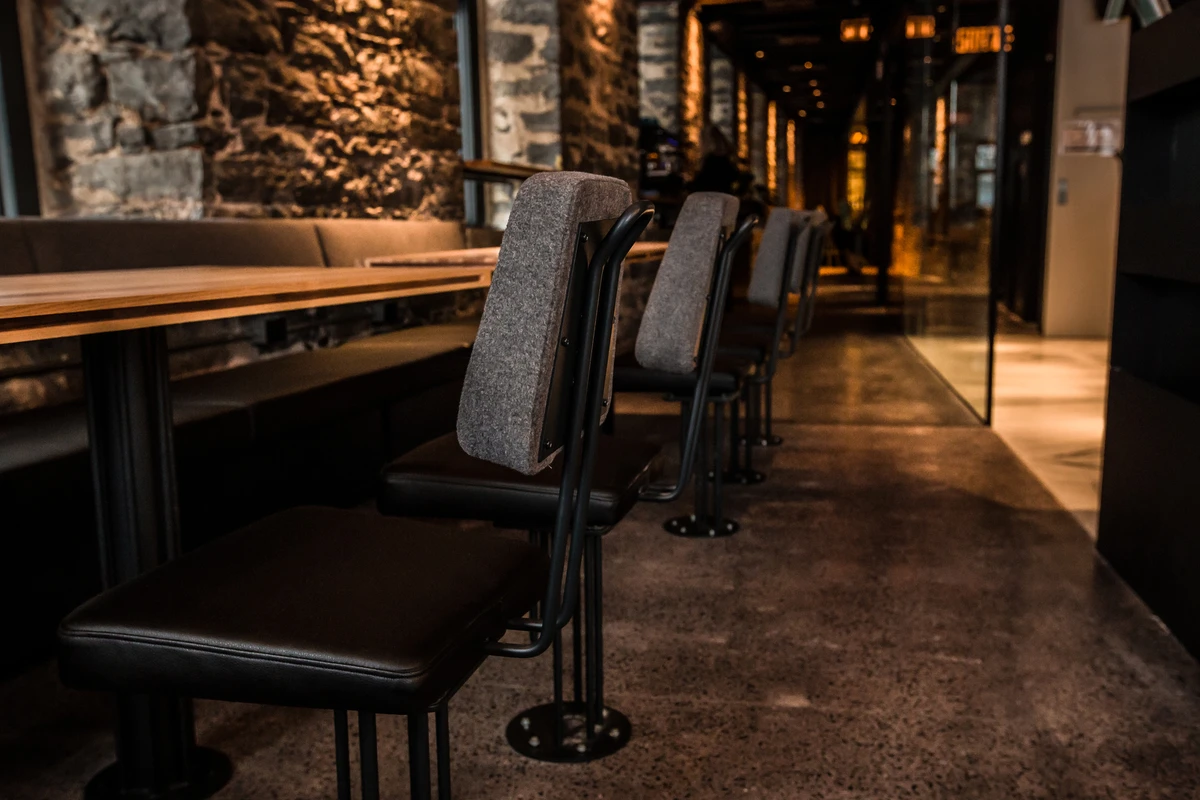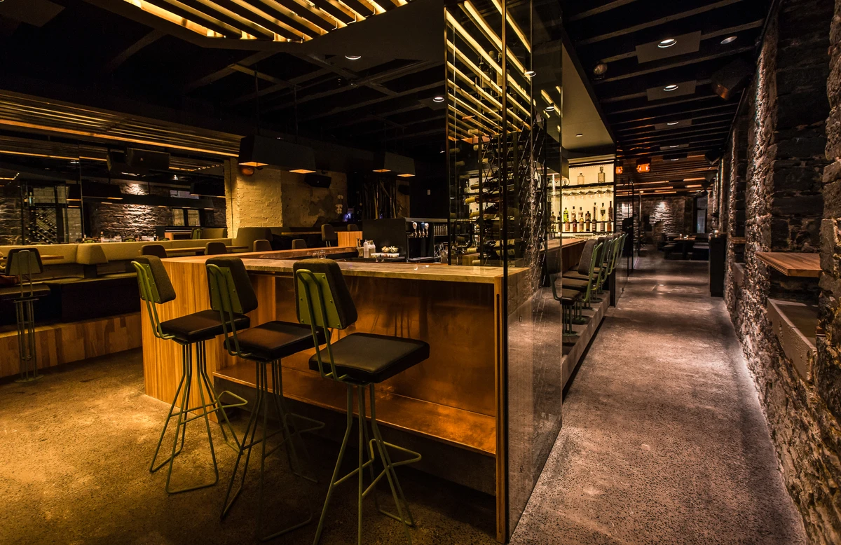 Niché au coeur du vieux port, au 22 rue Saint-Paul Est, l’établissement, à la fois bar et restaurant a trouvé refuge dans un vieux bâtiment en murs de pierres peints en noir. Le matériau est aussi présent à l’intérieur rappelant le passé du local tout comme le plafond dont on distingue les poutres ancestrales en bois. Une touche de finesse beaucoup plus moderne vient s’ajouter au décor par les luminaires de cuivre, de nombreuses parois de verre et du marbre. L’établissement baigne dans une lumière orangée qui lui confère une ambiance feutrée. La Firme signe cette réalisation qui a su créer une tension entre « le brut et l’actuel ». Le commerce d’Edward Zaki et de Jeff Stinco est divisé en trois temps, l’avant étant plus un bar et l’arrière, un restaurant plus illuminé et en haut, une salle pour les groupes.