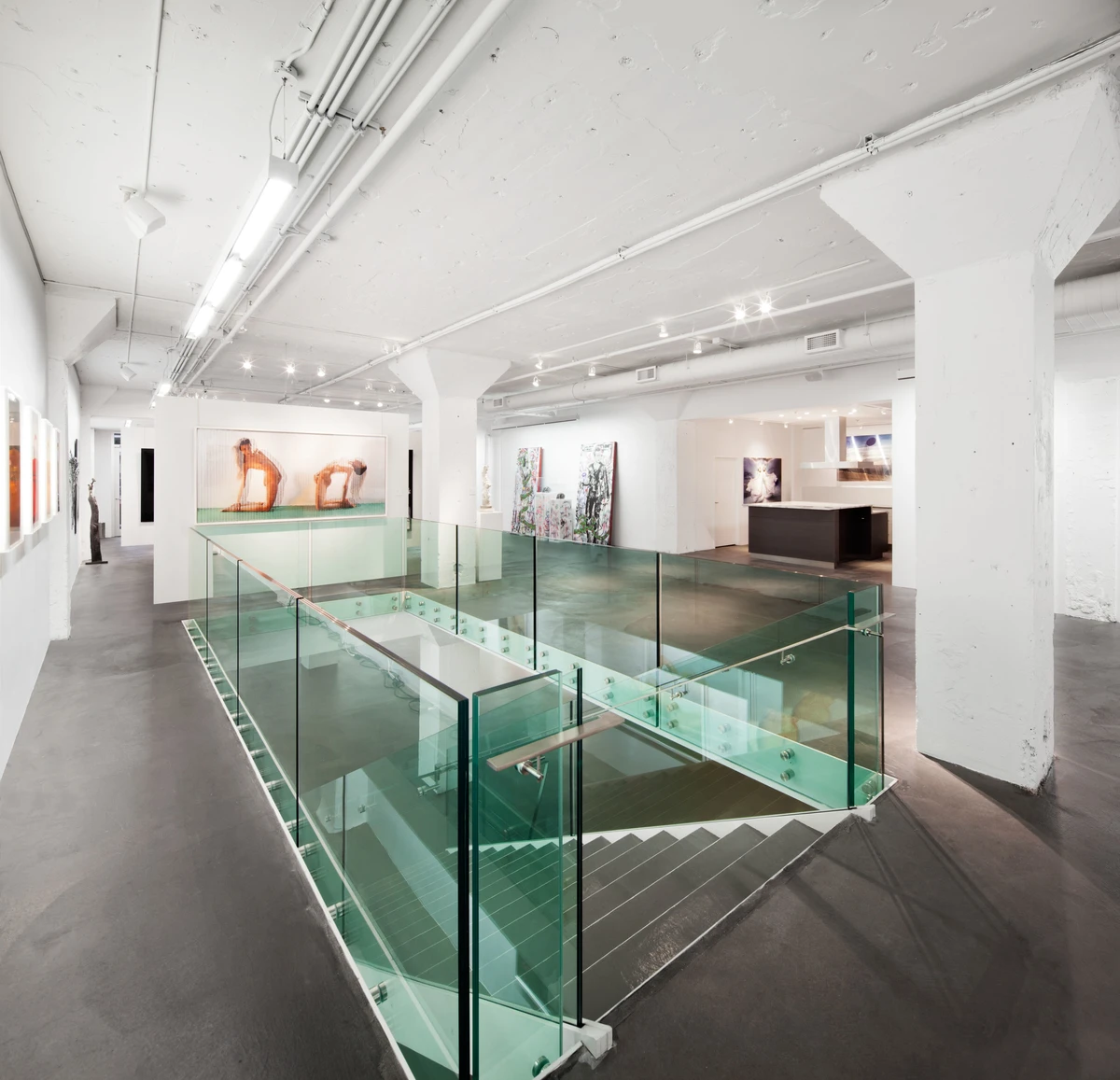 On ne distingue pas d’emblée ce qui diffère la galerie LeRoyer d’une autre. Il suffit pourtant de pousser la porte du 2170, rue de la Montagne, pour comprendre le travail qui y a été réalisé. Les murs sont blancs, pour laisser toute la place aux oeuvres exposées. Les lumières mettent l’accent sur ces dernières, comme pour leur laisser tout l’espace nécessaire et diffusent une lumière agréable. Au centre, un escalier massif, fait de béton à la base et de verre jusqu’au sommet, ouvre la voie vers le deuxième étage. Un verre aux teintes bleutées le garde, seule touche de couleur dans tout l’établissement à l’exception faite des tableaux. Offrant une décoration simple et épurée, la Galerie de Brian Brisson est étonnement chaleureuse, grâce à la conception de Gupta architecture.
