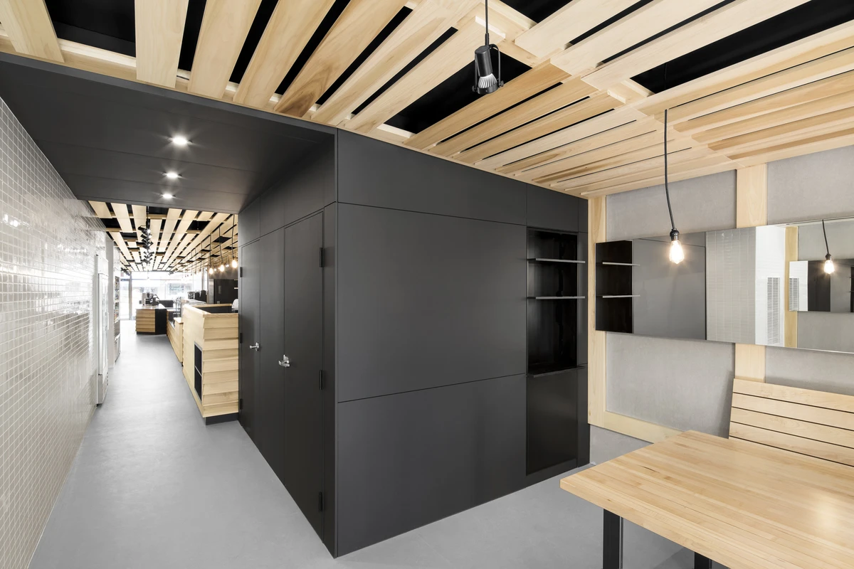 On retrouve la boulangerie au 5214, chemin de la Côte-des-Neiges. La petite façade trompe l’oeil, puisque le commerce est bâti en profondeur. Le plafond accentue en accentue la longueur avec un agencement aléatoire de lattes de bois qui laisse passer les lumières et qui crée du dynamisme dans l’espace. Tout au fond, une petite salle à manger dans une salle vitrée qui invite la lumière à entrer et les clients à s’asseoir un moment. Les couleurs grises, blanches et noires détonnent avec les traditionnelles boulangerie aux couleurs chaudes et des comptoirs en bois sont installés un peu partout. Du tout résulte une boutique contemporaine, loin des Pain Doré habituels. On doit ces transformation à Naturehumaine.