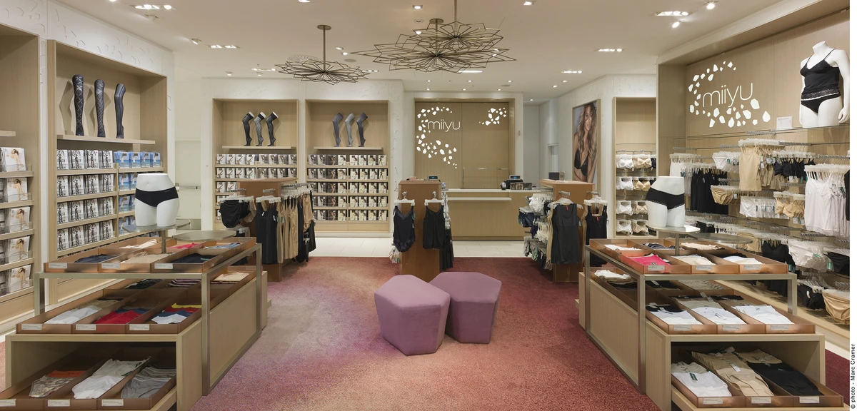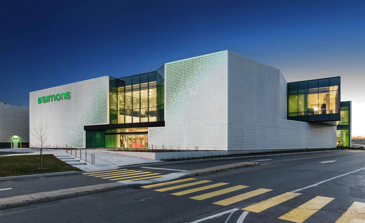 Bien visible du stationnement des Galeries D’Anjou, le magasin en impose de par sa taille et sa décoration extérieure, faite de petits points blancs et verts qui s’illuminent la nuit venue. Les deux étages sont à aire ouverte, mais bien structurés, permettant aux visiteurs de se sentir libre de flâner sans perdre la tête. L’entrée est décorée d’immenses lanternes situées au-dessus d’une structure de lattes de bois peintes en blanc. La section jeunesse est plus dynamique et colorée, tandis que la section pour femmes est beaucoup plus sobre et classique. Décoration intéressante à l’étage, on retrouve des têtes de cerfs fait de métal accrochés au mur. Lemay Michaud a réussi le pari de créer un espace chaleureux dans un centre commercial et cela relève de l’exploit.