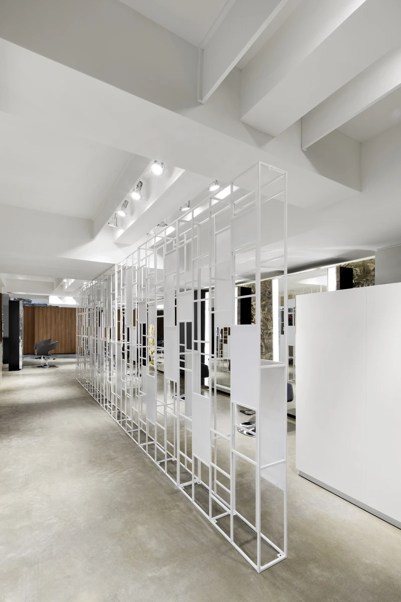 Le salon de coiffure niché dans un édifice historique au 360 Notre-Dame Ouest porte très bien son nom. La séparation de l’espace, tel que la cloison autoportante en métal blanc qui sépare le passage des chaises où travaillent les coiffeurs, crée une intimité particulière pour le client. Accueillis tout d’abord par un bureau élégant devant un mur de pierre, les visiteurs sont ensuite dirigés vers la salle d’attente aux allures de lounge qui invite à prendre son temps. La lumière s’adapte à chaque section du commerce. Elle est plus tamisée et chaude dans les lieux d’attente et plus franche dans les stations de travail. Bien qu’il soit situé dans un demi-sous-sol, de grandes fenêtres permettent à la lumière naturelle de pénétrer le salon, lui donnant de l’éclat. Un raffinement moderne qui s’agence bien avec le style rustique des murs de pierre. Le salon est une réalisation signée Blazys Gérard.