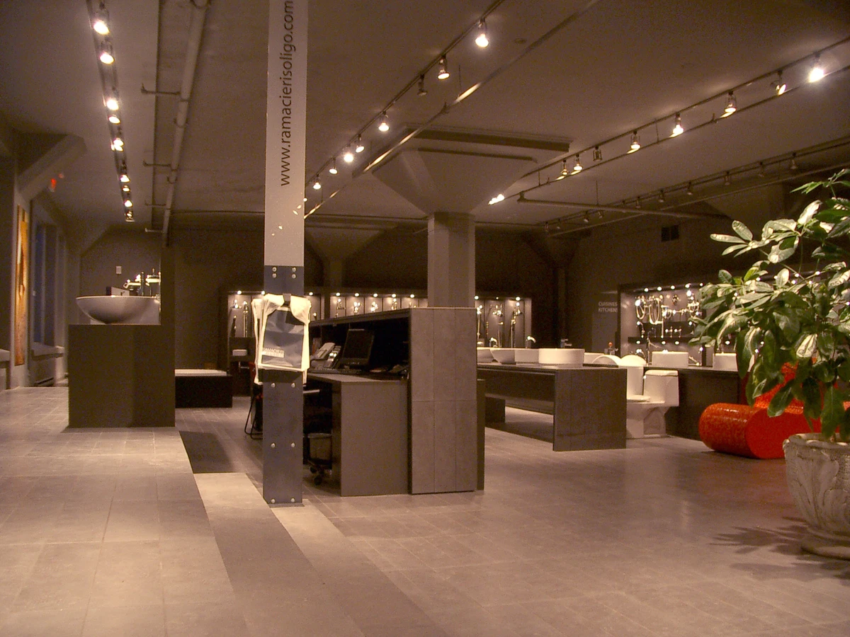 Étonnamment grand, le commerce des Ramacieri surprend par l’organisation maître qui y règne. Situé au 815 avenue Querbes, le lieu semi-industriel, met en scène des produits qui deviennent eux-mêmes décoration. La céramique et le marbre sont exposés de façon presque artistique, comme des oeuvres d’art, donnant envie aux visiteurs de s’attarder plus longtemps. Les postes de travail des conseillers sont accessibles et aménagés à aire ouverte, sans cloison, comme s’ils ne faisaient qu’un avec le décor. Les teintes de gris, de noir et de bleu tamisent et réchauffent l’espace pourtant lumineux. Les zones de services sont clairement identifiées et facilitent le parcours. Un projet sophistiqué créé par Alain Carle architecte.