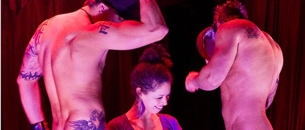 Dylan m’explique rapidement ce que je dois faire, pendant qu’Alexis me met une bouteille de Jack Daniel dans une main et un paquet de cartes dans l’autre. Une toune endiablée commence. Les deux gars s’avancent et se dandinent voluptueusement. Ils enlèvent leur chemise, dévoilant leur ample buste mis en valeur par des bretelles bien serrées. C’est maintenant mon tour. N’en revenant pas du comique de la situation, je m’avance sur la scène, accueillie par les applaudissements des filles hystériques. Je m’assois à la table qui trône au centre de la scène, puis les gars viennent me rejoindre. Je leur distribue cinq cartes chacun, pendant que Dylan nous verse des verres de fort. On boit, ils continuent leur chorégraphie, moi je suis crampée, et (évidemment, ils avaient omis de me parler de ce bout-là) ils terminent leur performance en exhibant leur phallus à quelques centimètres de mon visage. Les rideaux se referment. Épique.
