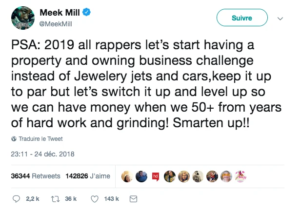Meek Mill a également suivi la tendance, alors qu’il a proposé en décembre dernier que les rappeurs, au lieu d’afficher leurs voitures et leurs bijoux, affichent plutôt leurs propriétés immobilières lors d’un « property and business owning challenge ». Si on est toujours dans la démonstration de l’opulence, au moins on se retrouve dans un créneau qui récompense les bons investissements.