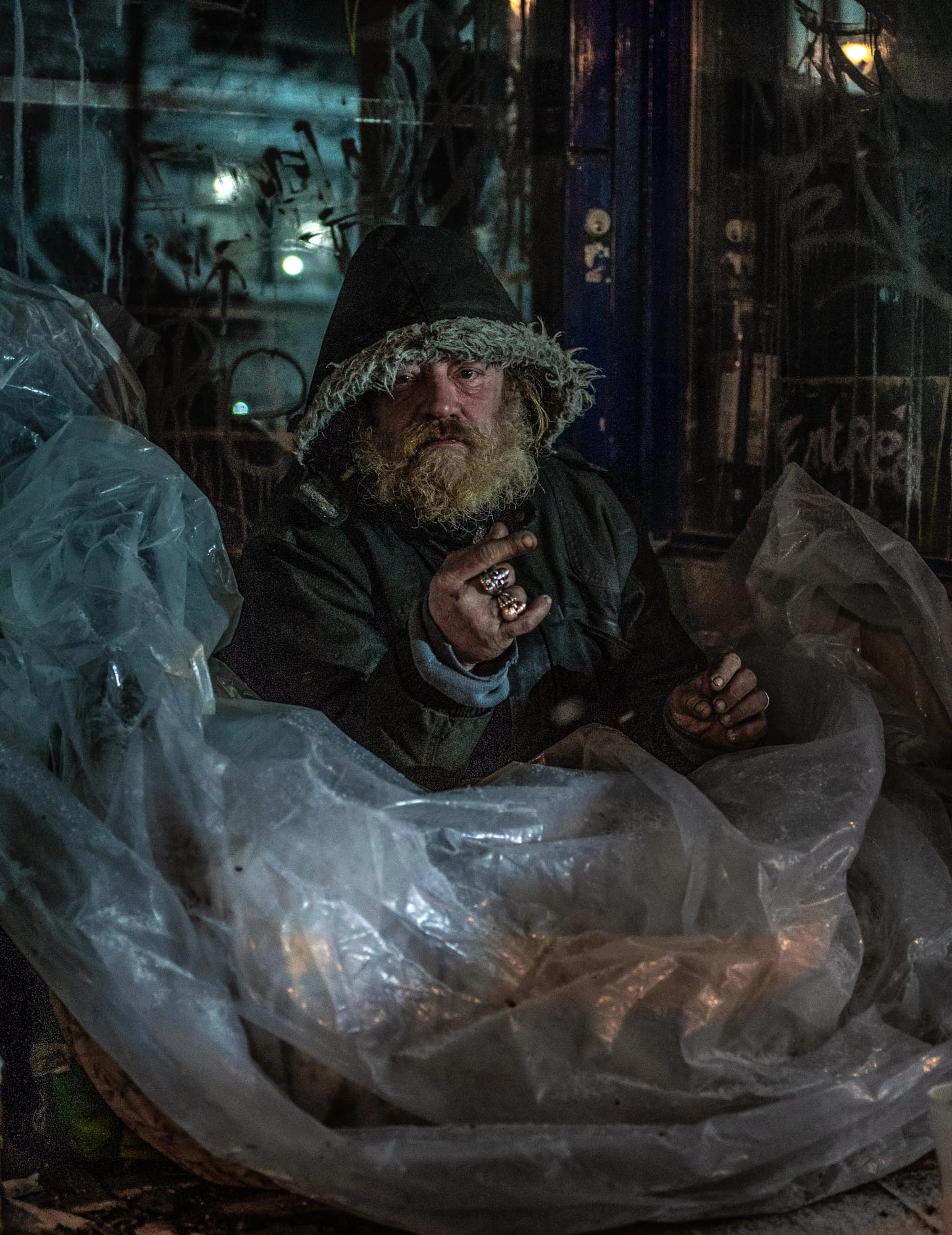 Il est habillé chaudement et possède plusieurs couvertures en plus de son sac de couchage (son quatrième, puisqu’on lui en a volé trois depuis cet été).