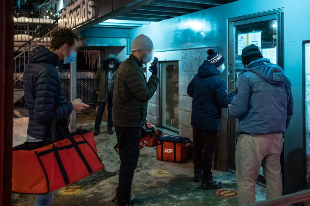 À quelques mètres de là, une demi-douzaine de livreurs d’Uber Eats font le pied de grue devant une succursale du McDo en attendant leur commande. Ils exhibent leur cellulaire à travers la porte vitrée à l’attention de l’employée de la chaîne, débordée, qui sort ensuite un à un les sacs remplis de malbouffe.