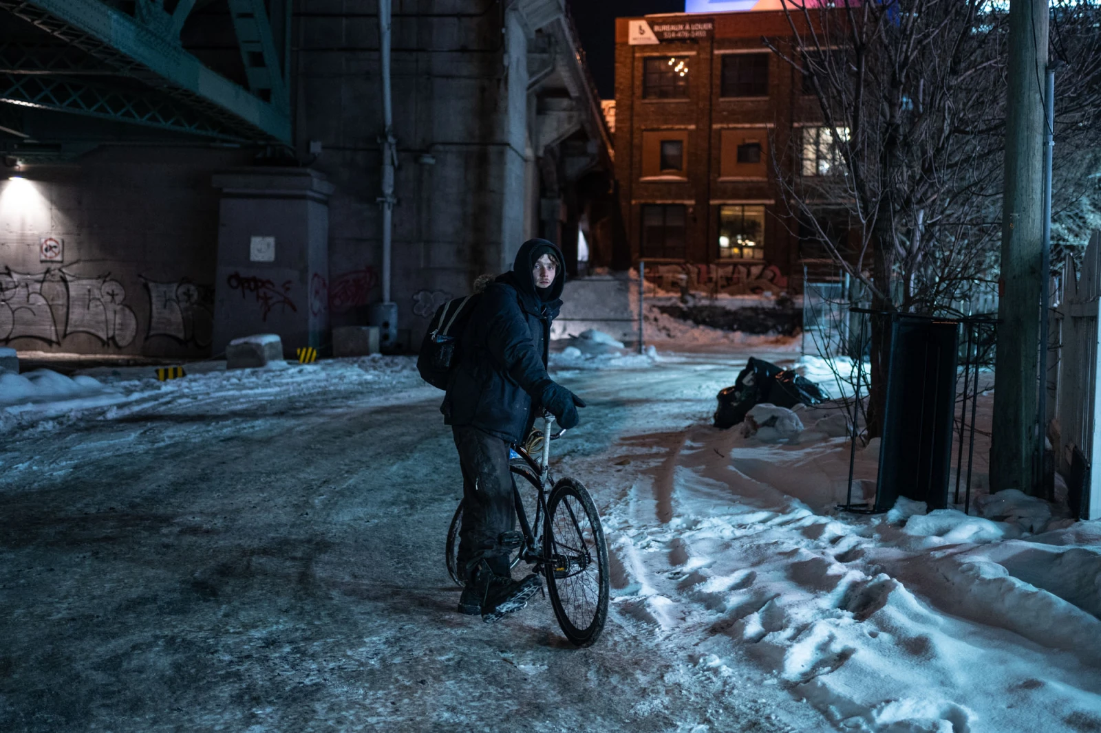 L’une d’elles est justement garée au coin Papineau et Sainte-Catherine, devant un jeune homme en train de s’échiner à hisser la base métallique d’un sofa-lit sur son vélo. « Les policiers me connaissent et veulent juste s’assurer que je vais bien », m’explique Will, après le départ de la patrouille.